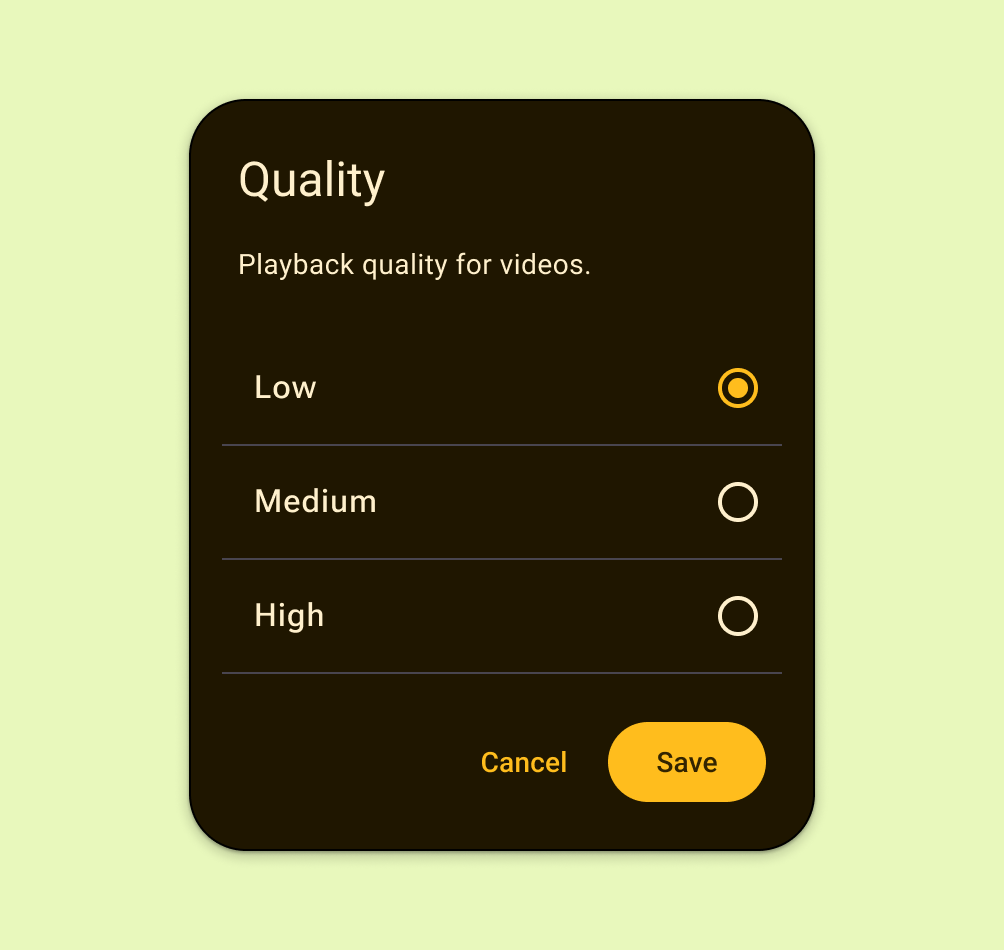 قدِّم خيارات تخصيص إضافية أو بديلة لتحسين تجربته، ولكن لا تُكرِّر الإعدادات التي يوفّرها النظام أو تستبدِلها. على سبيل المثال، قد يضيف تطبيقك نظامًا لاختيار المظاهر من أجل تخصيص أكبر أو يقدّم عناصر تحكّم أكثر دقة في الصوت.