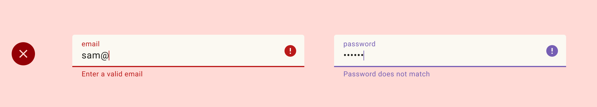 In the following example, an app uses red to indicate an error in one text field, but purple for the other–this would cause confusion when skimming a form.