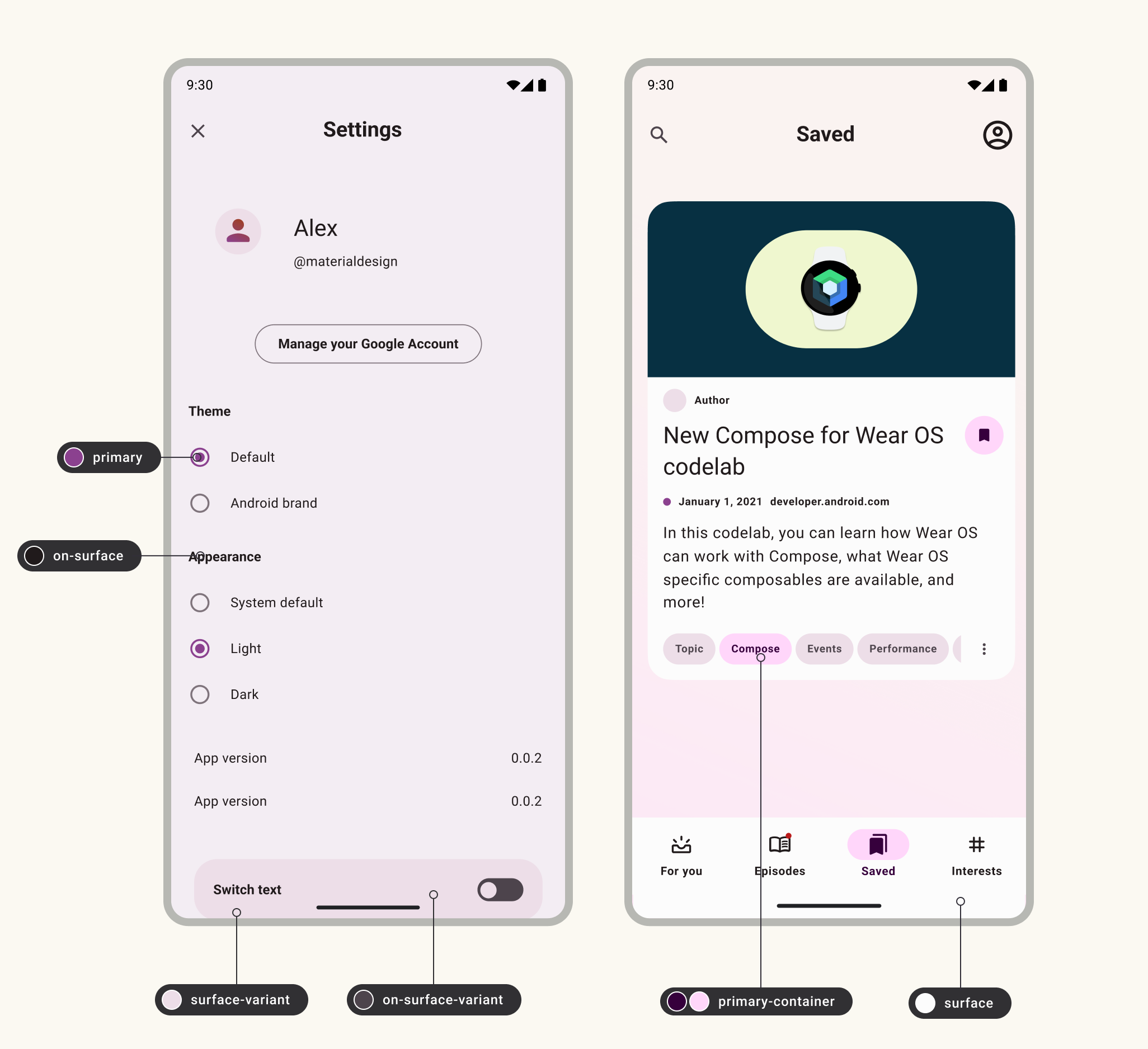颜色值是在颜色文件 color.kt 中使用 Compose(或使用 View 的 color.xml)设置的。设置为样式的这些颜色属于主题的一部分。如需详细了解,请参阅设计 Android 移动主题。