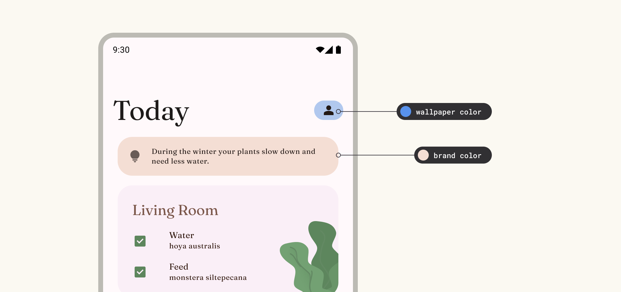 A theme typically impacts an overall app, but can also be applied selectively and alongside other themes. Avoid too many themes and combinations by keeping with a hierarchy: a primary theme source (whether dynamic or custom) that applies to the majority of the UI.