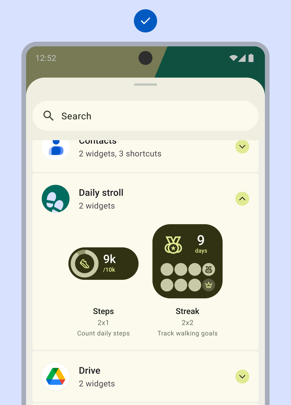 Приложения могут поддерживать неограниченное количество виджетов. Однако средство выбора виджетов должно быть ориентировано на демонстрацию только критически важных задач и полезных вариантов. Ограничьте предварительный просмотр в средстве выбора 6–8 вариантами. Разрешите доступ к дополнительным вариантам через экран подтверждения.