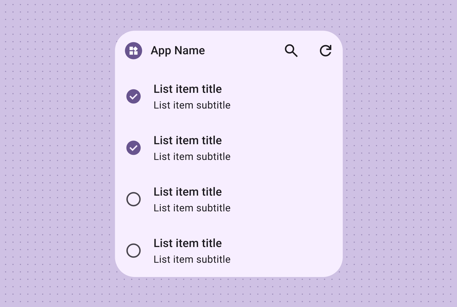 効果的なウィジェット レイアウトを作成するには、まずコア コンテンツを特定します。レイアウトは、ウィジェット内で情報とインタラクティブな要素を整理する方法を示します。Android には、ツールバー、テキスト、リスト、グリッドタイプのウィジェット用に、このプロセスを効率化するためのいくつかのビルド済みレイアウトが用意されています。
