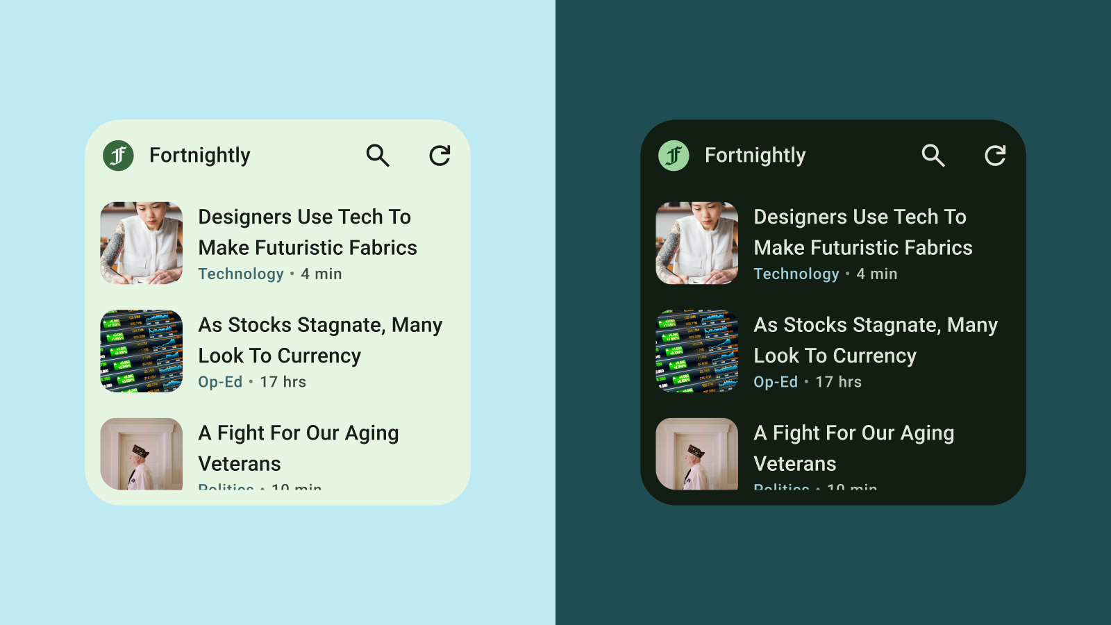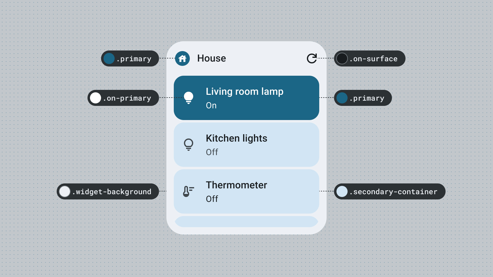 Od Androida 12 widżet może używać kolorów motywu urządzenia do przycisków, tła i innych komponentów. Zapewnia to spójność wizualną różnych widżetów, ikon na ekranie głównym i tapet, co zapewnia użytkownikom Androida bardziej spójne wrażenia. Użycie dostarczonych tokenów kolorów gwarantuje, że widżet będzie wyglądać spójnie w tematach urządzeń udostępnianych przez różnych producentów urządzeń oraz w tematach dynamicznych ustawianych przez użytkownika.