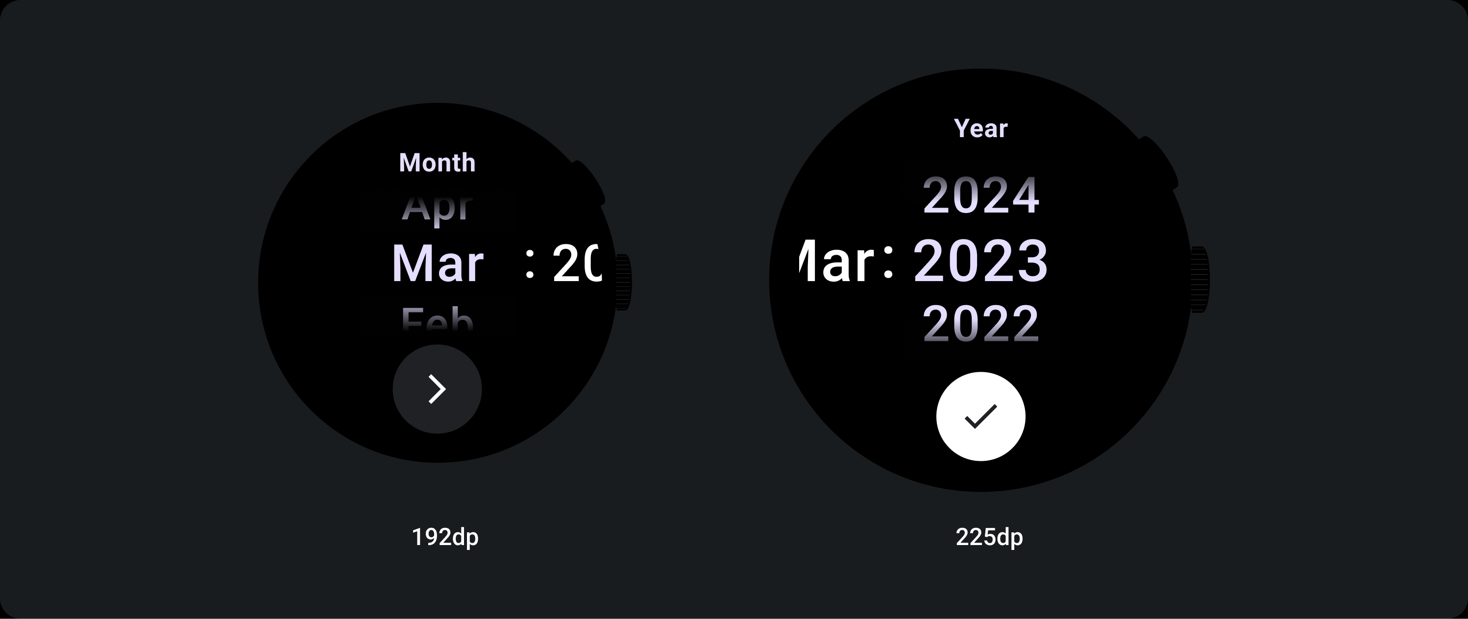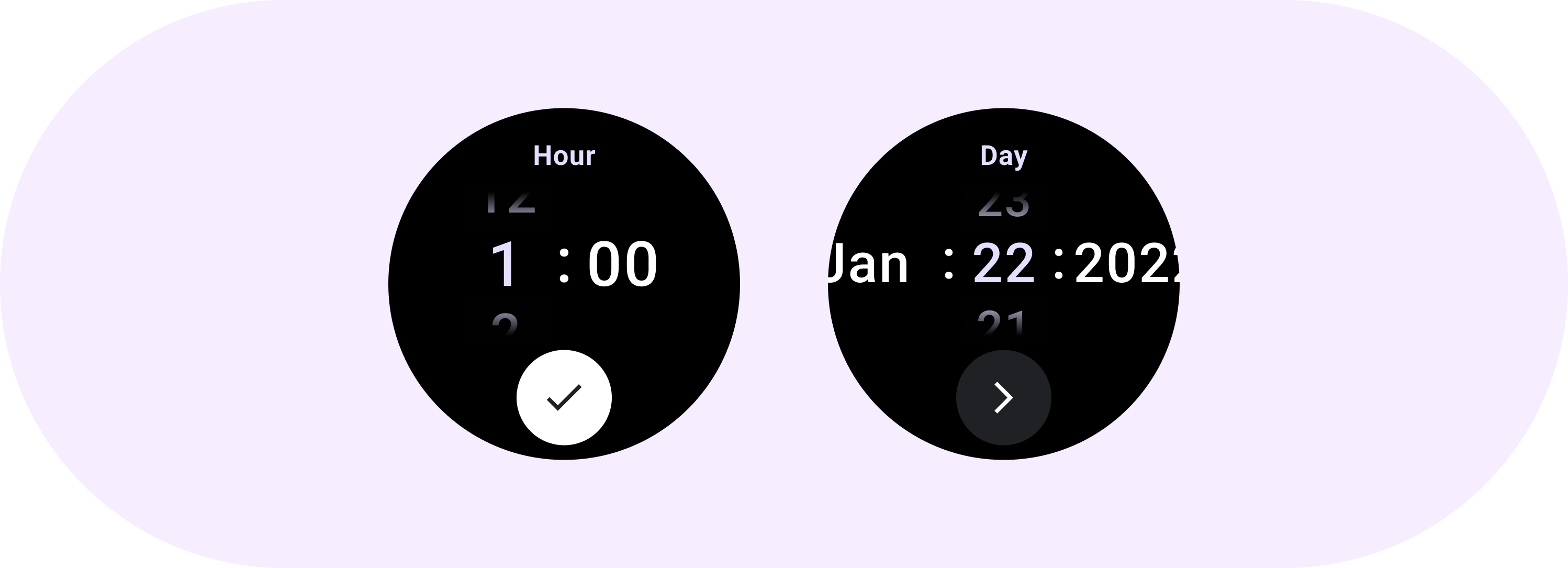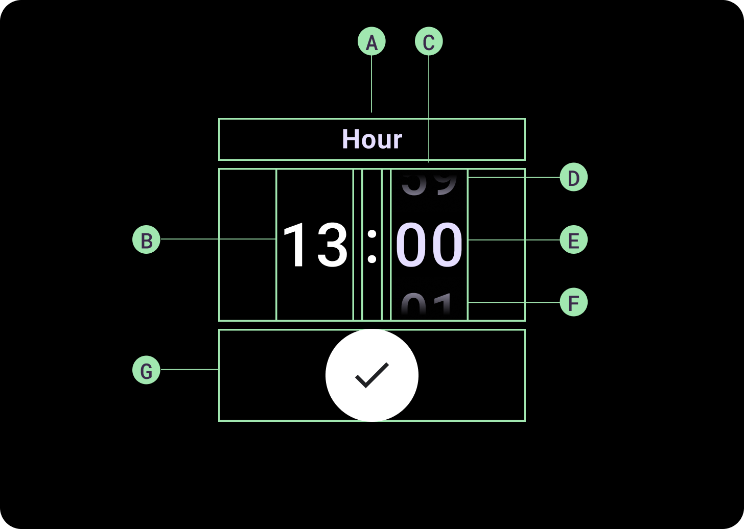 선택 도구 그룹이 사용 가능한 높이와 너비를 채웁니다. 선택 도구 열에는 4가지 레이아웃 옵션이 있습니다. 각 레이아웃은 가운데에 배치되며 사용 가능한 높이를 채웁니다. 열 너비는 글꼴에 필요한 자릿수를 수용하는 데 필요한 너비로 정의됩니다. 날짜 선택 도구는 예외로, 가로로 화면을 채우고 가장자리에서 블러 처리됩니다.