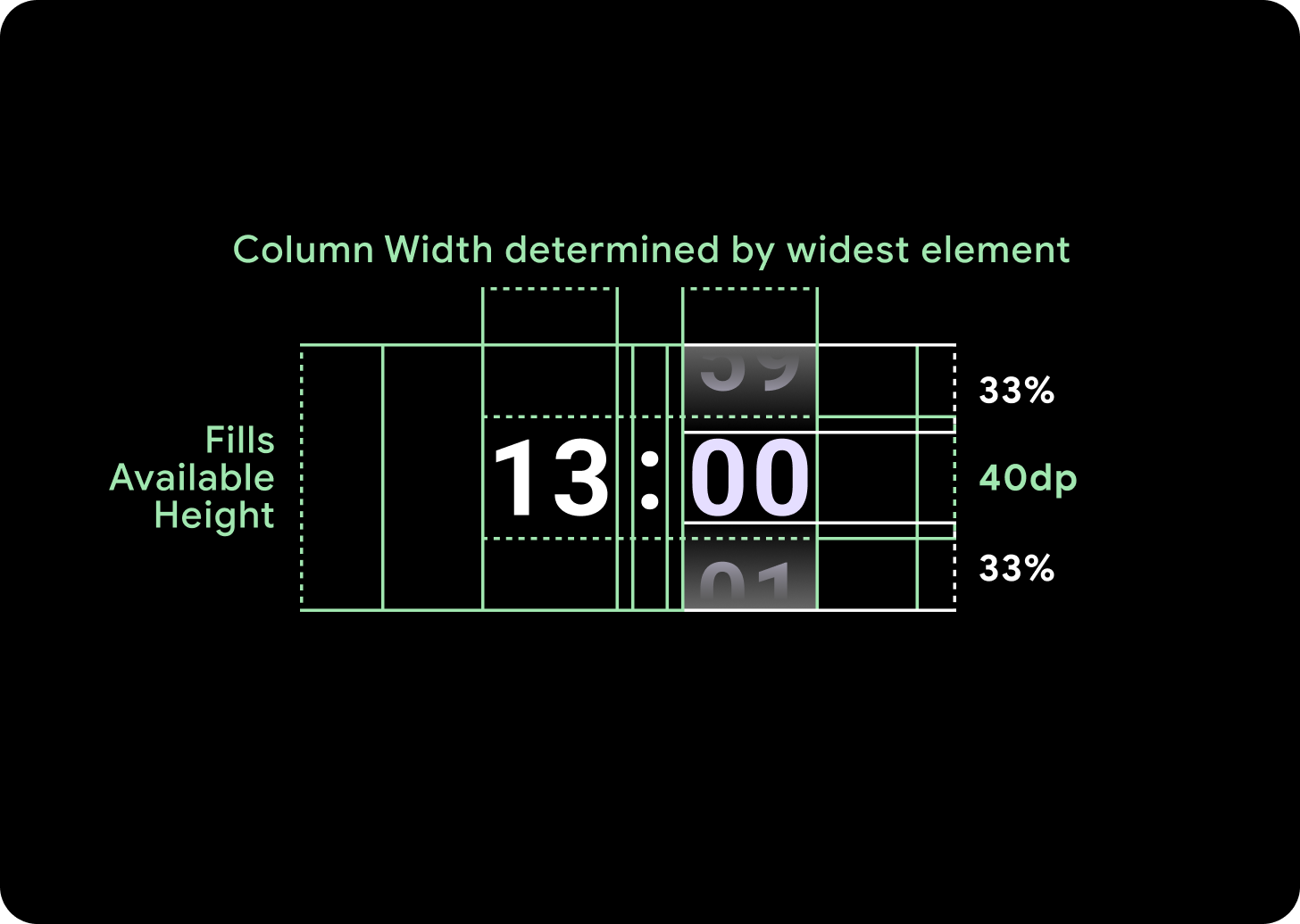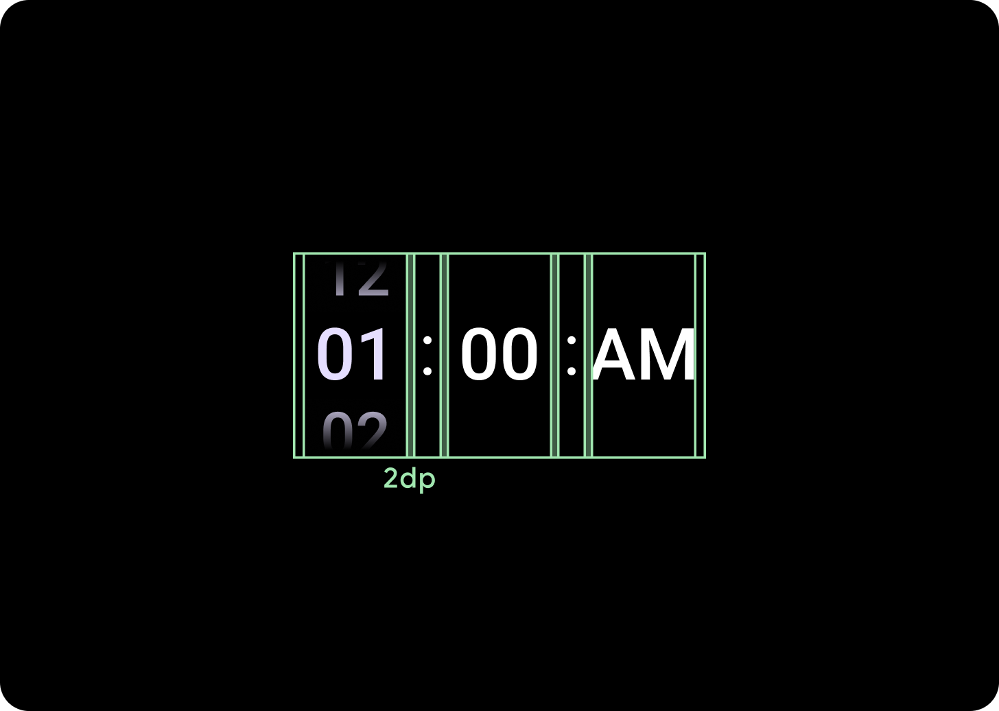 Nhóm bộ chọn sẽ lấp đầy chiều cao và chiều rộng có sẵn. Có 4 lựa chọn bố cục cho các cột bộ chọn. Mỗi bố cục được căn giữa và lấp đầy chiều cao có sẵn. Chiều rộng cột được xác định theo chiều rộng cần thiết để chứa số chữ số cần thiết trong phông chữ, Bộ chọn ngày là trường hợp ngoại lệ, theo chiều ngang, nó lấp đầy màn hình và tràn ra ngoài cạnh.