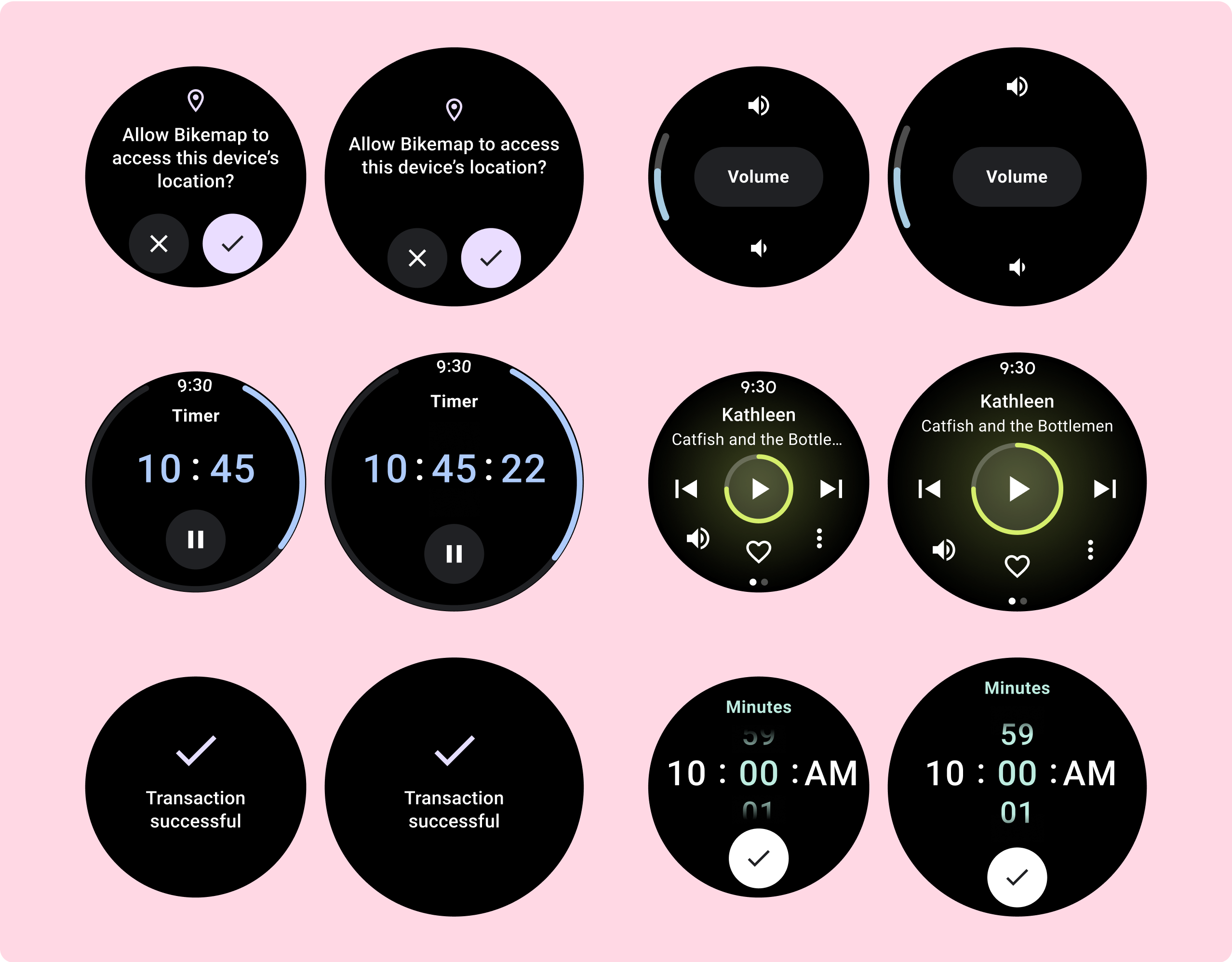 Non-scrolling app view layouts include media players, pickers, switchers, and special fitness or tracking screens using progress indicators. You can restrict the height of any screen, which ensures the user is focused on one task or set of controls, rather than needing to browse through a list of options. To accommodate devices with smaller screen sizes, design with the limited size in mind, ensuring glanceability and embracing the circular screen where relevant.