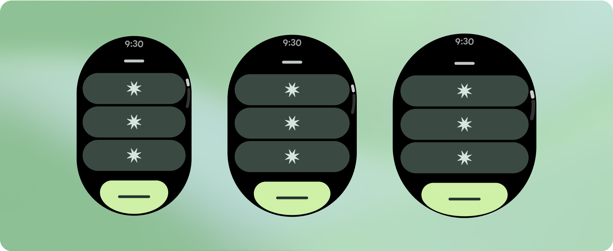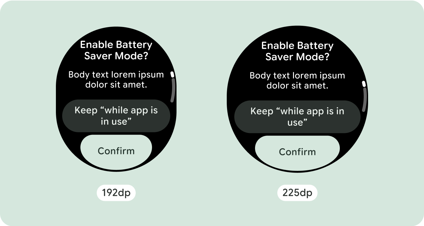 Đối với các thiết kế màn hình độc đáo, hãy kiểm thử kỹ lưỡng trên nhiều kích thước màn hình, đảm bảo các thành phần và phần tử thích ứng một cách trơn tru và tránh cắt nội dung. Lề theo tỷ lệ phần trăm của chúng tôi giúp khoảng đệm mở rộng hiệu quả. Bạn nên sử dụng điểm ngắt ở 225 dp để giới thiệu thêm thông tin và tăng cường chức năng trên màn hình đồng hồ lớn hơn.