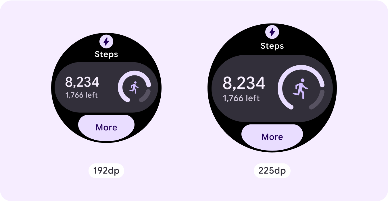 আপনি যদি আমাদের ProtoLayout টেমপ্লেটগুলি ব্যবহার করেন, তাহলে আপনি Wear ProtoLayout Jetpack লাইব্রেরির সর্বশেষ বিটা রিলিজের মাধ্যমে এই আপডেটগুলি স্বয়ংক্রিয়ভাবে উত্তরাধিকার সূত্রে পেতে পারেন৷ এছাড়াও, আপনাকে শুধুমাত্র লেআউট সরবরাহ করতে হবে যেখানে আপনি একটি স্ক্রীন আকারের ব্রেকপয়েন্টের পরে অতিরিক্ত সামগ্রী বা উপাদান যোগ করেছেন। কিভাবে একটি বড় স্ক্রীন সাইজের সুবিধা নিতে হয় সে সম্পর্কে সম্পূর্ণ নির্দেশনা এবং সুপারিশের জন্য, আমাদের [টাইলস নির্দেশিকা] দেখুন [2]। টাইলগুলির একটি নির্দিষ্ট স্ক্রিনের উচ্চতা থাকে, তাই আমরা অবাঞ্ছিত ক্লিপিং তৈরি না করে সীমিত স্ক্রীন রিয়েল এস্টেটকে সর্বাধিক করার জন্য প্যাডিং সামঞ্জস্য করেছি।