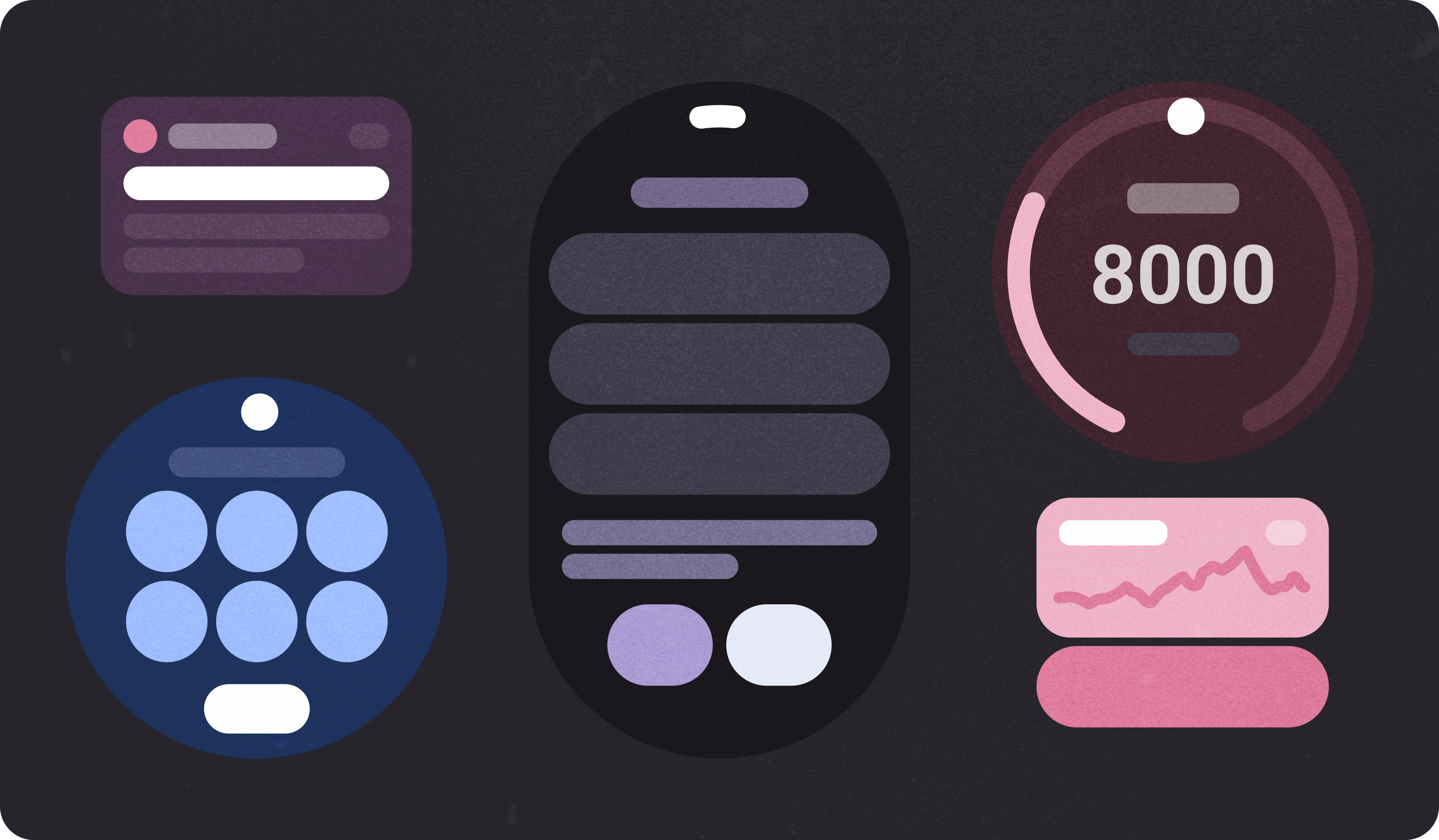 Większość urządzeń z Wear OS ma okrągłe ekrany, które mają o 22% mniej miejsca na interfejs niż wyświetlacze kwadratowe. Na okrągłych ekranach tekst musi być też oddzielony większymi marginesami, aby był czytelniejszy.