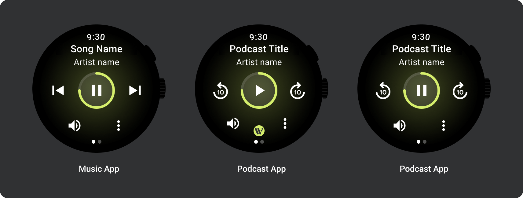 मीडिया ऐप्लिकेशन में मीडिया कंट्रोल स्क्रीन भी शामिल होनी चाहिए. पांच बटन वाले लेआउट का इस्तेमाल करके, मीडिया कंट्रोल बनाएं. इससे यह पक्का होता है कि टैप के कम से कम टारगेट पूरे किए जाएं. यहां संगीत ऐप्लिकेशन और पॉडकास्ट ऐप्लिकेशन के लिए मीडिया कंट्रोल के उदाहरण दिए गए हैं: