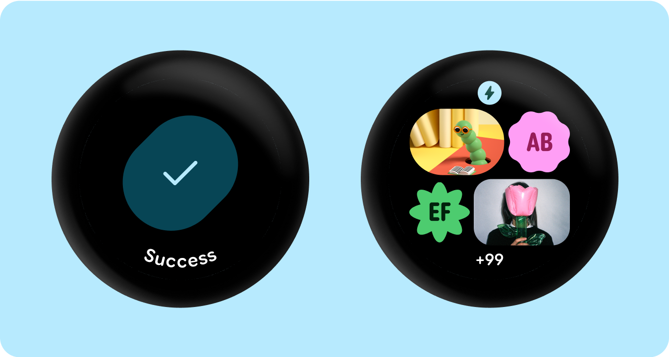 Außerdem nutzen wir die Formensprache auf viel umfassendere und aussagekräftigere Weise, indem wir flexible Containerformen verwenden, um das Abrunden und Schärfen von Eckenradien zu ermöglichen und so das Morphing von Listen und Schaltflächenstatus zu unterstützen. Wir führen randbündige Schaltflächen als neues, eigenes und ikonisches Designmuster für runde Geräte auf Wear ein.