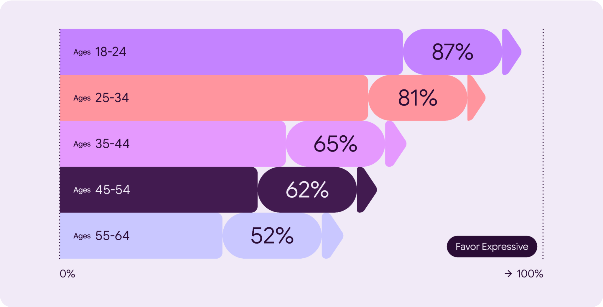 Nghiên cứu cho thấy người dùng Google xem thiết bị di động và trải nghiệm phần mềm là một phần của bản thân họ. Người dùng cũng mong đợi trải nghiệm ứng dụng phản ánh các lựa chọn ưu tiên của họ về kiểu (màu sắc, loại và độ tương phản) cũng như hành vi, chẳng hạn như ưu tiên các ứng dụng và thao tác thường dùng. Nhu cầu này đặc biệt phổ biến với những thế hệ trẻ có thị hiếu và kỳ vọng linh động.