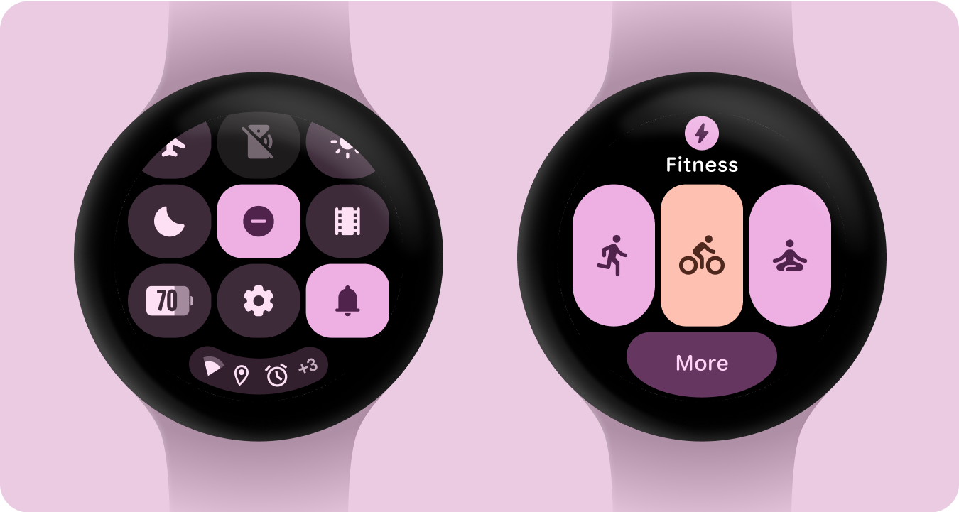 Os apps no Wear OS são exibidos em várias plataformas projetadas em torno de como as pessoas interagem com o relógio, sendo as plataformas principais complicações e blocos.