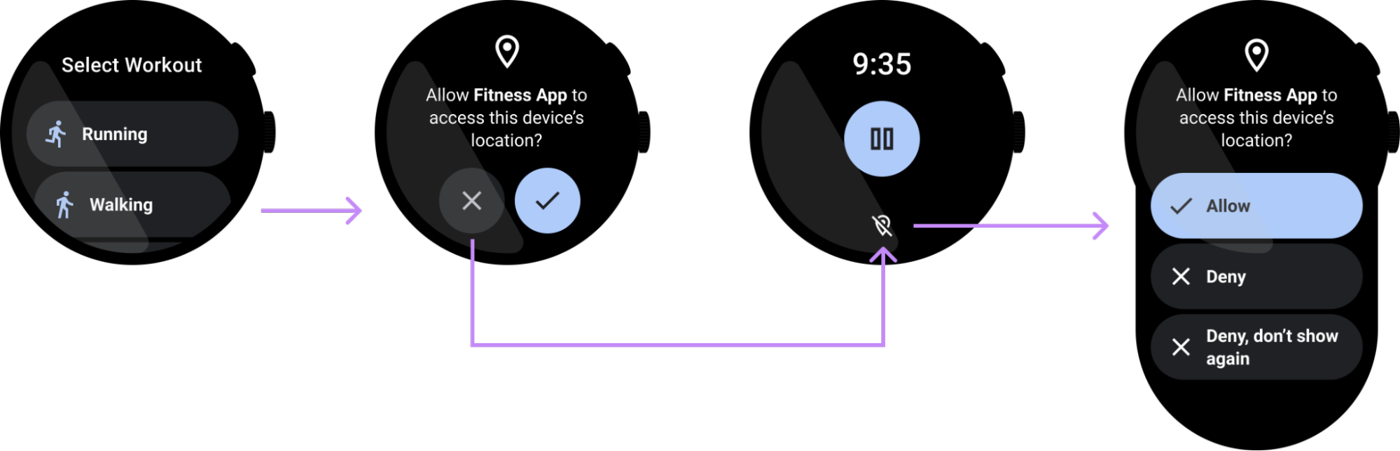Wear OS'in bir saat uygulamasına izin vermesi gerektiğinde, kullanıcıdan bu izni kabul etmesini veya reddetmesini isteyen bir iletişim kutusu görüntülenir. Uygulamalar, iznin neden gerekli olduğu açıkça belli olduğu zaman ve yerde izin istemelidir.