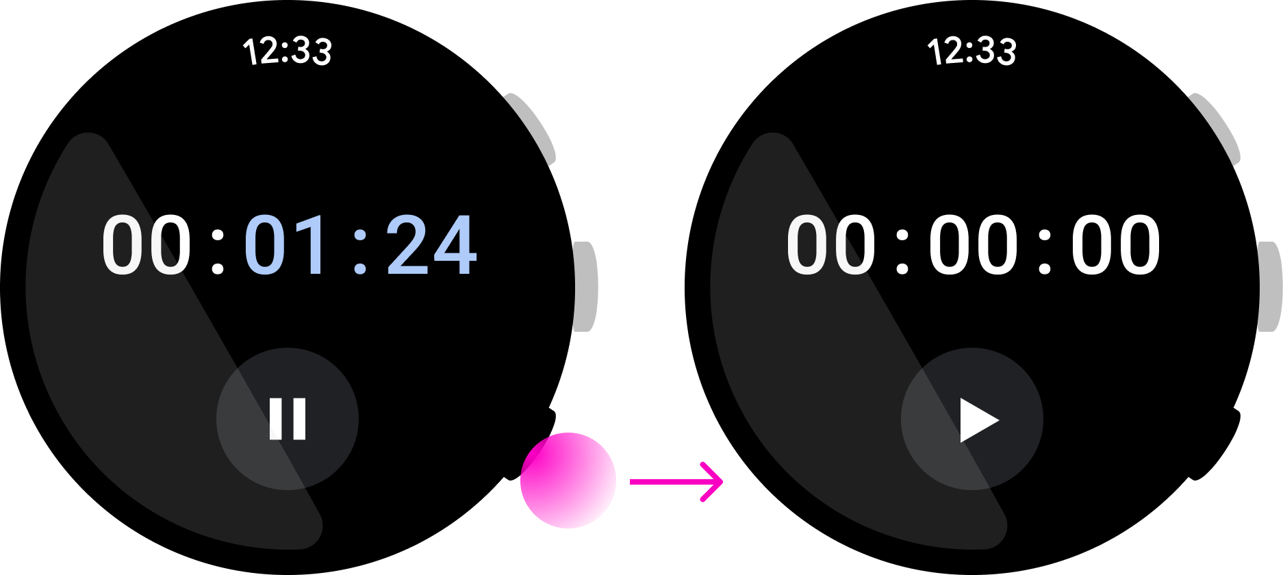 איור 3. באפליקציית הכושר הזו, הפעולה 'השהיה/המשך' מוקצית ללחצן רב-פונקציונלי, שמאפשר למשתמש לבצע את הפעולה בלי להסתכל במסך.