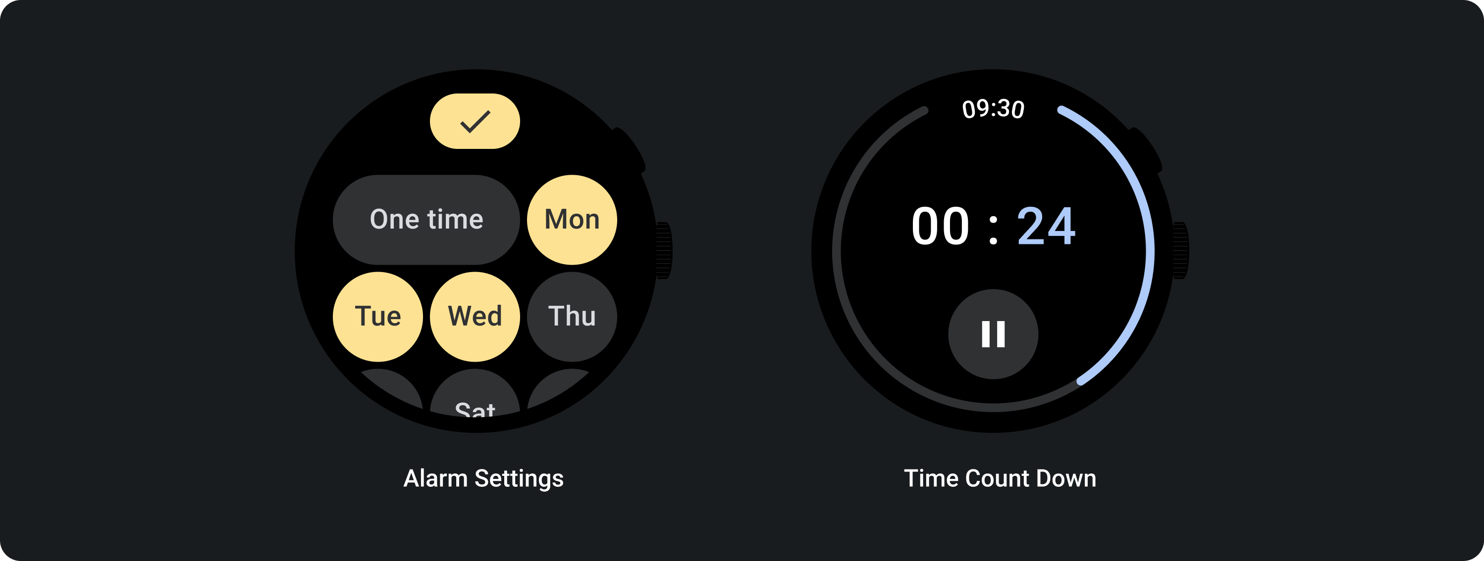 Niski poziom natężenia (tylko ikona)Przyciski o niskim stopniu podkreślenia są wyróżnione brakiem wypełnienia. Najlepiej sprawdzają się na mniejszych obszarach tarczy zegarka, gdzie potrzebne jest kompaktowe rozmieszczenie. Użyj koloru Na powierzchni dla treści.