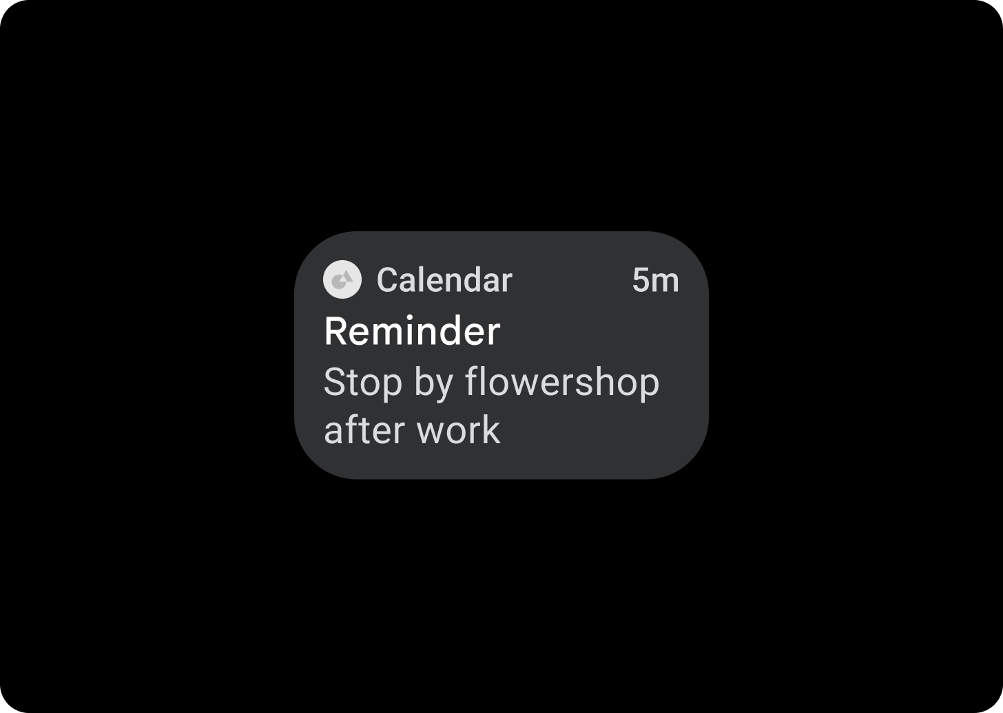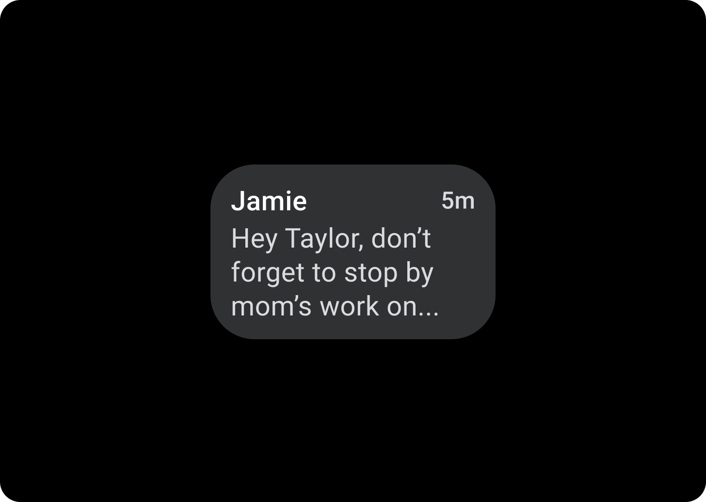 किसी ऐप्लिकेशन में जानकारी दिखाने के लिए, टाइटल कार्ड का इस्तेमाल करें. जैसे, कोई मैसेज. टाइटल कार्ड में तीन स्लॉट वाला लेआउट होता है. इसमें टाइटल, समय फ़ील्ड (यह वैकल्पिक है), और काम का कॉन्टेंट शामिल होता है. कॉन्टेंट, इमेज या टेक्स्ट में से कोई एक होता है.