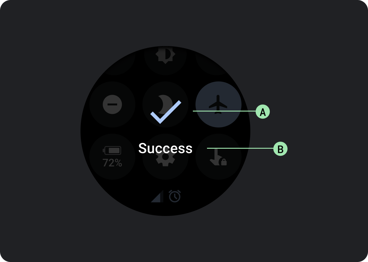 Komponent potwierdzenia wyświetla użytkownikowi wiadomość z potwierdzeniem przez krótki czas. W odróżnieniu od komponentu w Material Design komponent potwierdzenia w Wear OS nie umożliwia użytkownikom ostatecznego potwierdzenia wyboru.