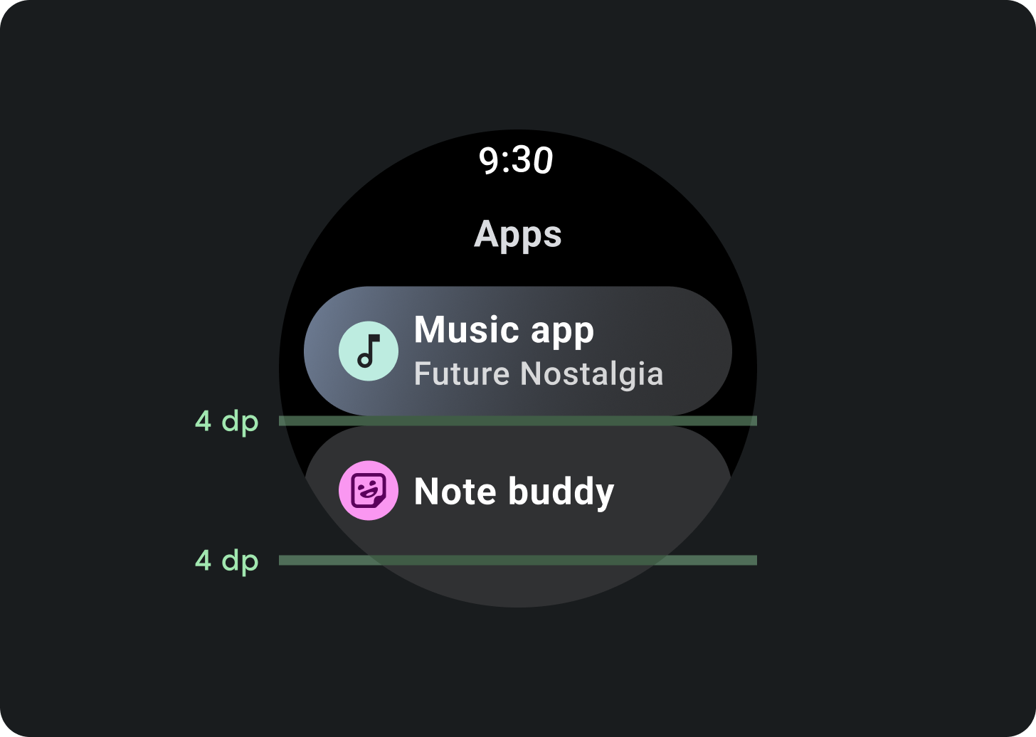 يتم استخدام الحشوات الموحدة عند إنشاء قائمة اعتمادًا على العنصر. وإذا كانت هناك حاجة إلى مزيد من المساحة المتروكة العمودية للقوائم الأكثر تعقيدًا، يتم ضبط التباعد على مضاعفات 4 dp لتحقيق الاتساق.