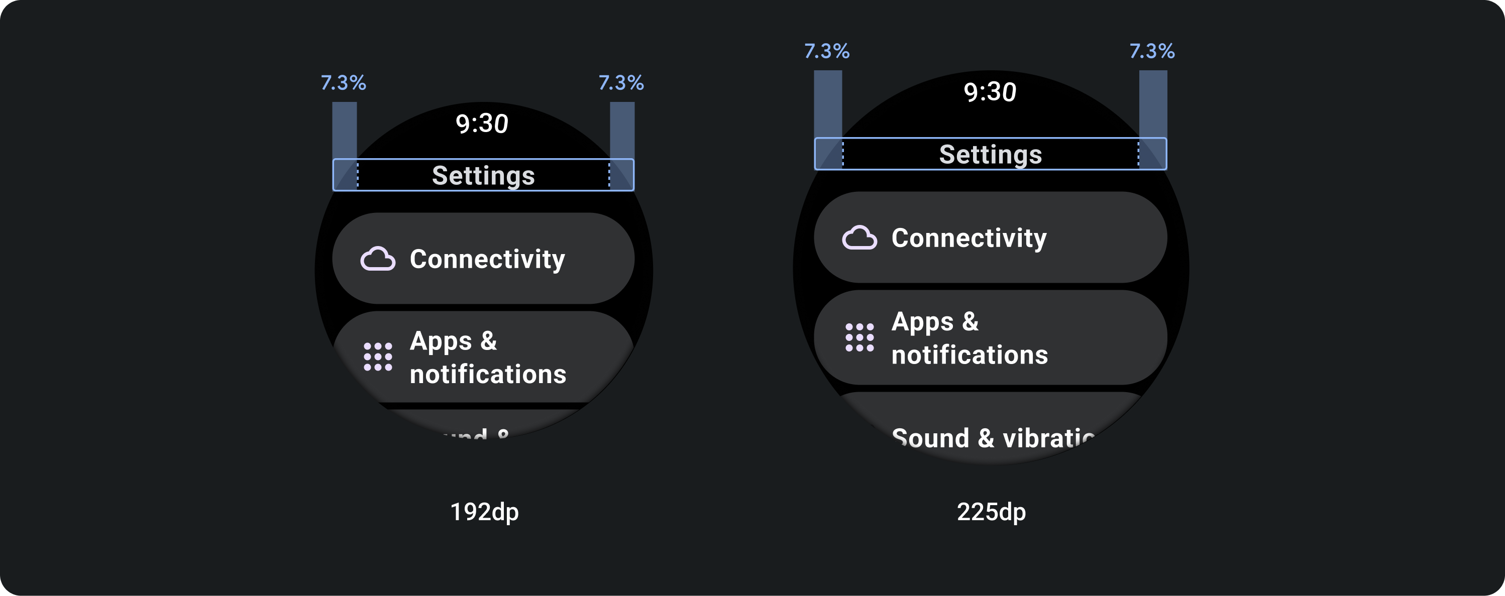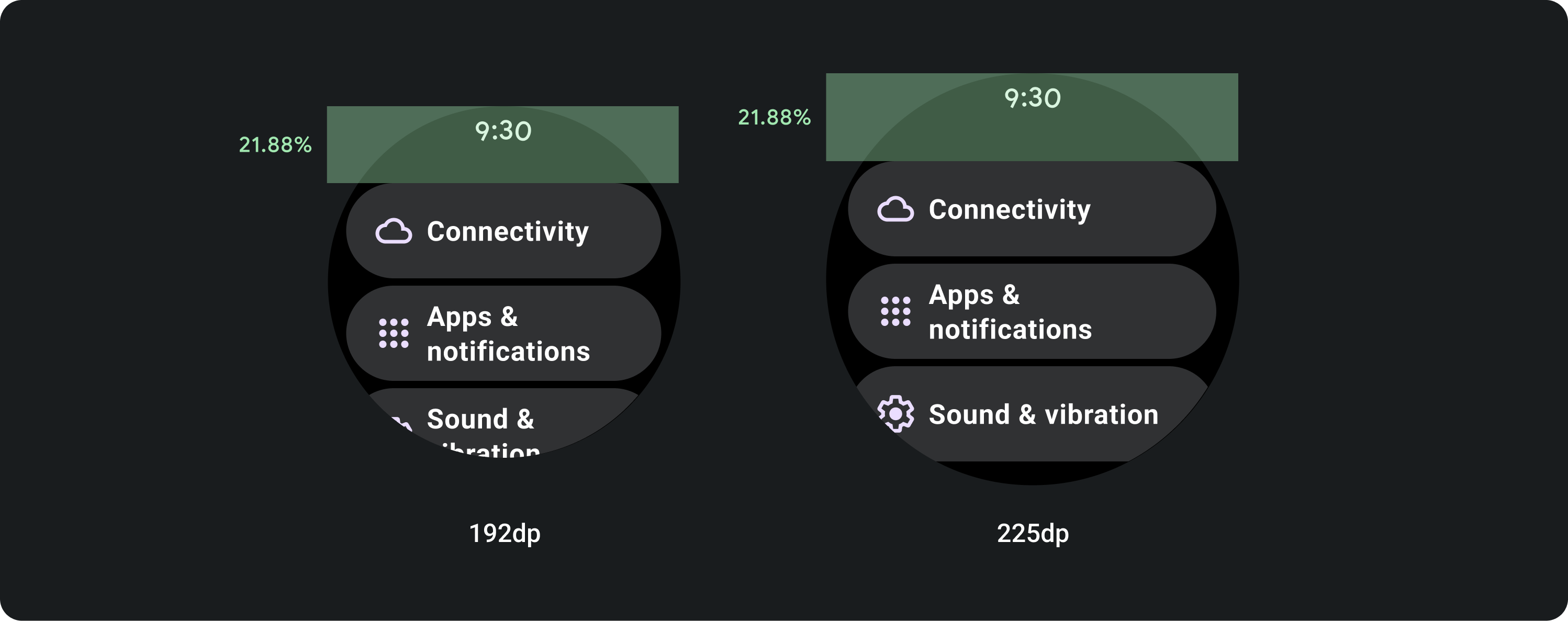 सूचियों में निश्चित या परिवर्तनशील ऊंचाई के आइटम हो सकते हैं. सूची के कॉन्टेंट में इतना मार्जिन होना चाहिए कि उसे सर्कुलर स्क्रीन में दिखाया जा सके.