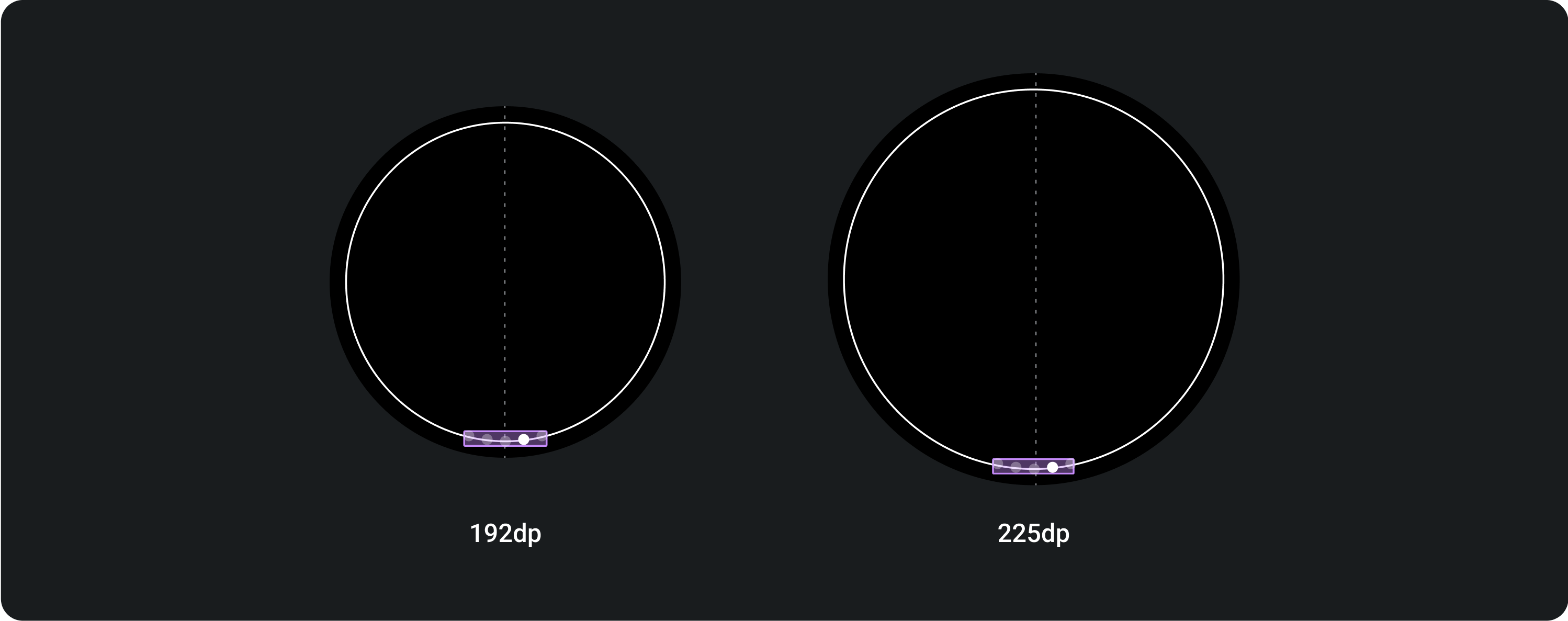 ドット(インジケーター)の円周の中心は、光学バランスのため、円形グリッドの近くまたはそれの上に揃います。つまり、画面サイズが大きくなるにつれて、曲線の角度がわずかに変化します。
