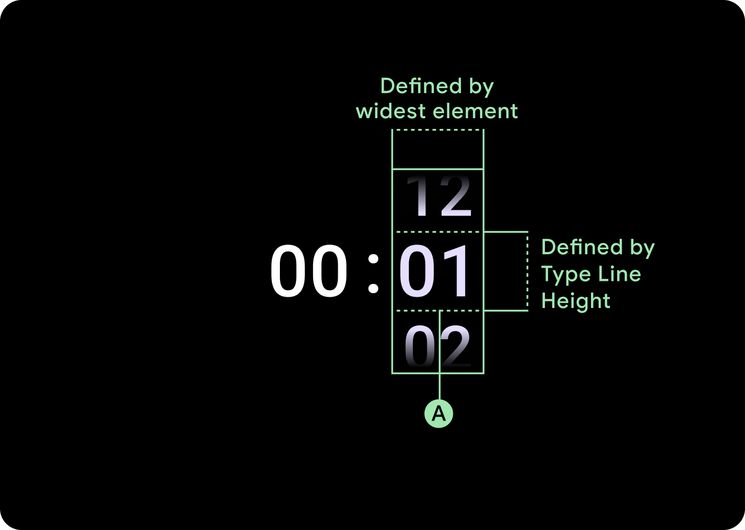 Die Auswahlgruppe füllt die verfügbare Höhe und Breite aus. Für die Auswahlspalten gibt es vier Layoutoptionen. Jedes Layout ist zentriert und füllt die verfügbare Höhe aus. Die Spaltenbreite wird durch die Breite bestimmt, die für die Anzahl der Ziffern in der Schrift erforderlich ist. Die Datumsauswahl ist die Ausnahme: Sie füllt horizontal das Display aus und geht über den Rand hinaus.