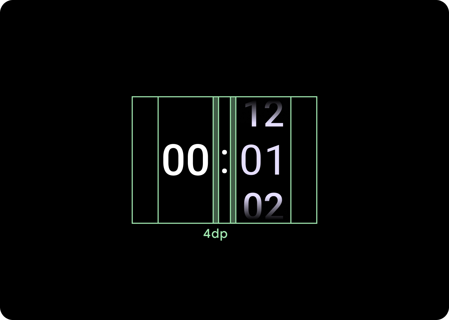 המרווח בין העמודות משתנה אחרי נקודת העצירה (breakpoint) של 225px ואילך, ומתחיל ב-2dp או ב-4dp וגדל ל-6dp. זה תלוי בפריסה שבחרתם: פריסה עם 2 עמודות או פריסה עם 3 עמודות.