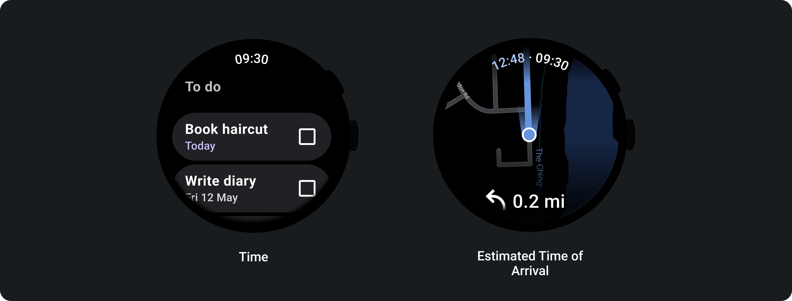 Saati görüntülemek için saat metnini ve ekranın üst kısmında isteğe bağlı bir etiket kullanın. Cihazda yuvarlak ekran süresi metni kavisli olur. Cihazın ekranı dikdörtgen içinde olduğunda zaman metni düzdür.