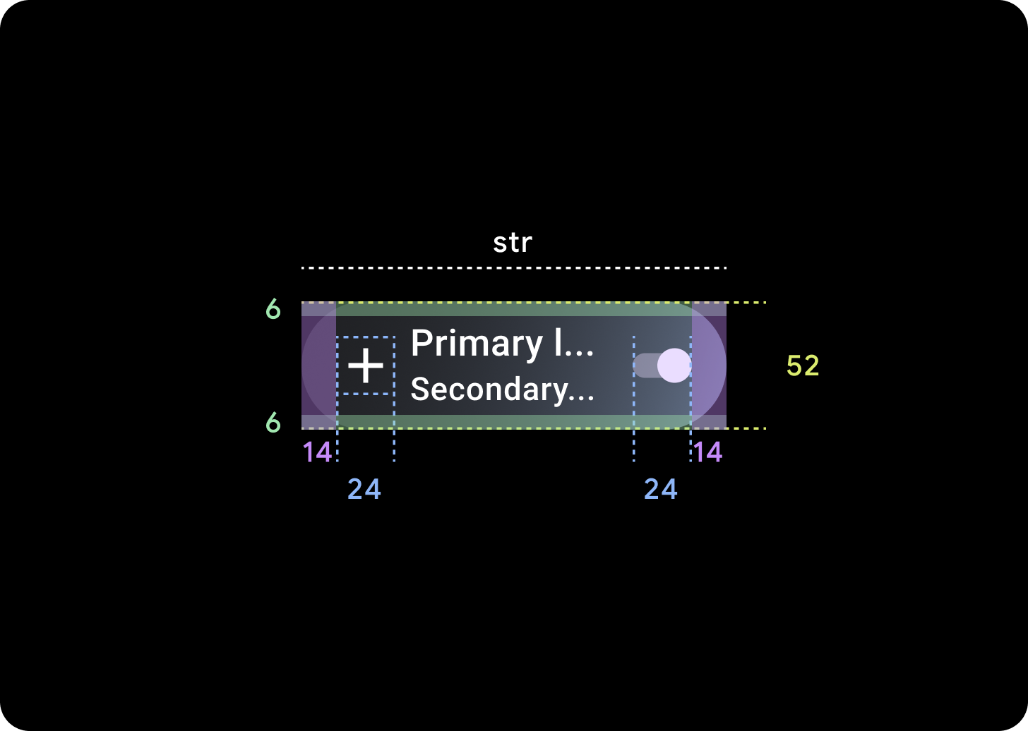 Toggle chips have four slots that accommodate two text labels, one selection control and one application icon. The icon and secondary label are optional.