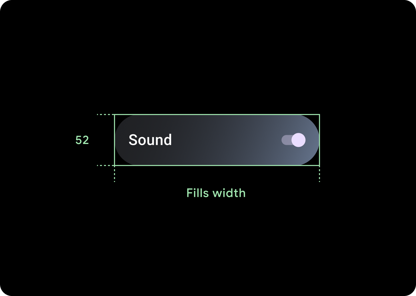 Toggle chips include a bi-state toggle control. Some examples of a bi-state toggle control include a switch, radio button, or checkbox. Use toggle chips for situations in which many options may need to be quickly and easily set, such as in Settings.