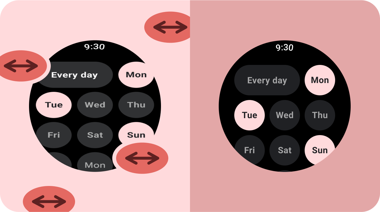 ממשקי משתמש רספונסיביים מתרחבים ומשתנים כדי לנצל בצורה הטובה ביותר את כל שטח המסך הזמין, ללא קשר לגודל המסך שבו הם מוצגים. כשאתם מעצבים פריסות עם תגובה דינמית במסך עגול, לכל תצוגה עם גלילה ותצוגה ללא גלילה יש דרישות ייחודיות כדי לשמור על שינוי הגודל של רכיבי ממשק המשתמש, וגם לשמור על פריסה ותצוגה מאוזנות. בתצוגות גלילה, מומלץ להשתמש באחוזים כדי להגדיר את כל השוליים העליונים, התחתונים והצדדיים, כדי למנוע חיתוך ולספק שינוי פרופורציונלי של הגודל של הרכיבים. בתצוגות ללא גלילה, צריך להשתמש באחוזים ובאילוצים אנכיים לכל השוליים. כך התוכן הראשי באמצע יוכל להתרחב ולמלא את האזור הזמין.