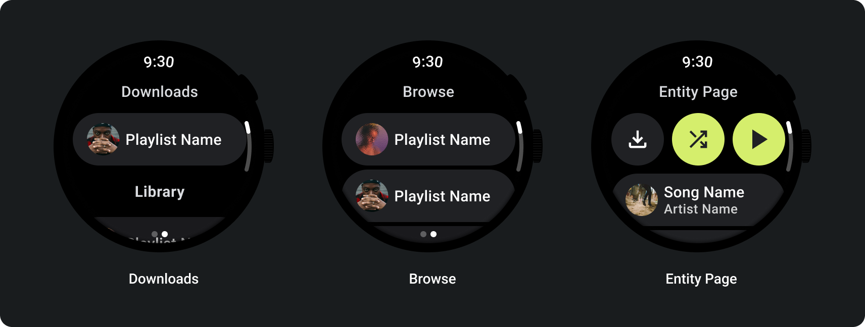Buat aplikasi media yang memenuhi persyaratan desain Wear OS. Aplikasi media sering kali menyertakan halaman Jelajahi dan Entity.