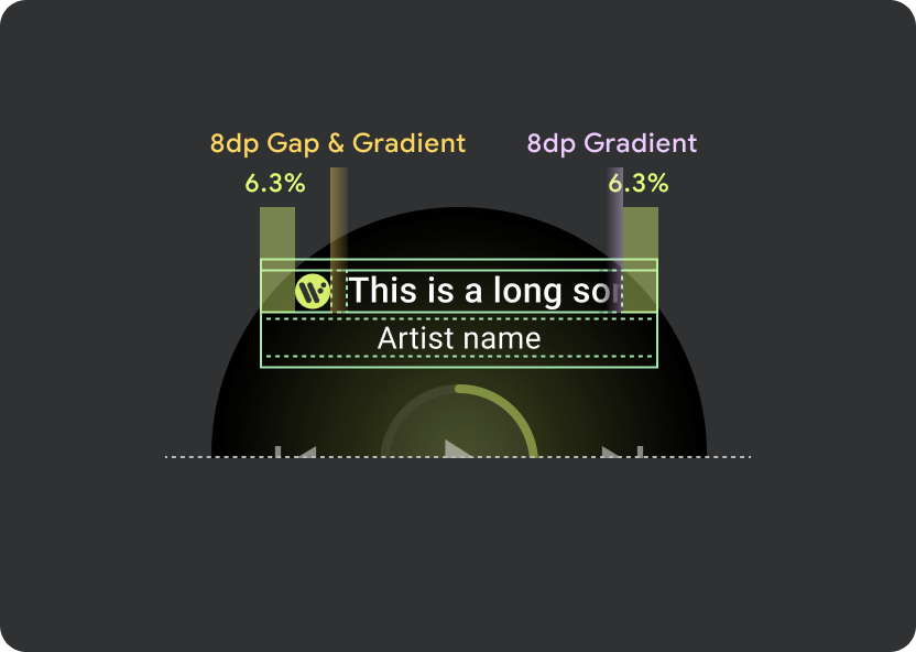 Dalam header, gunakan margin universal sebesar 9,38%, dengan margin Judul lagu tambahan sebesar 6,3%. Gunakan gradien 8 dp untuk men-scroll judul, dan celah 8 dp tambahan (dengan gradien 8 dp) saat ikon ada. Sertakan transisi scroll marquee di bawah ikon, yang posisinya tetap tetap.