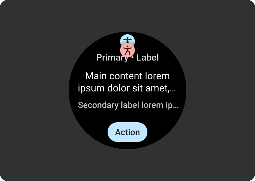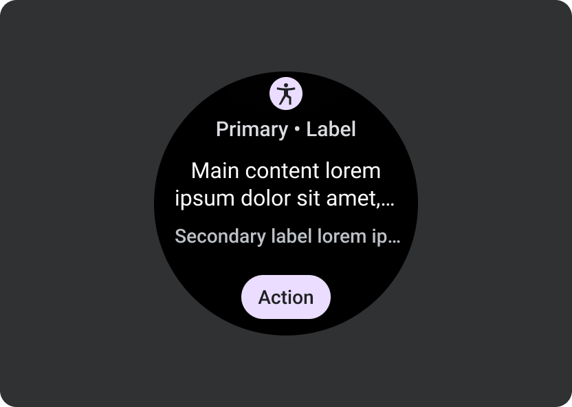 Untuk mengakomodasi berbagai ukuran layar Wear OS, template tata letak ProtoLayout Material dan tata letak desain Figma menyertakan perilaku responsif, yang memungkinkan slot beradaptasi secara otomatis. Slot dirancang untuk mengisi lebar yang tersedia. Slot konten utama dan label sekunder memeluk konten, tetapi penampung yang menyimpannya mengisi tinggi yang tersedia. Margin ditetapkan sebagai persentase, dengan margin dalam tambahan yang ditambahkan ke slot di bagian bawah dan atas layar, yang memperhitungkan fluktuasi kurva layar saat membesar.