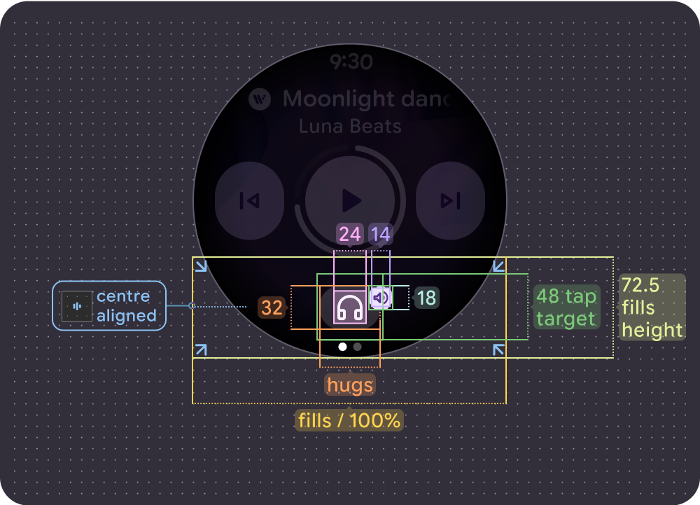 Main controls and bottom buttons use the available space to maximize the tap target. The minimum tap target size is 48 x 48 dp on Wear OS devices, with icons and buttons aligned to the center of the tap target.