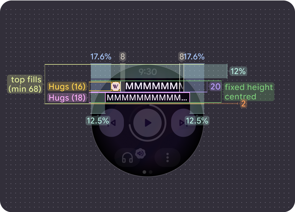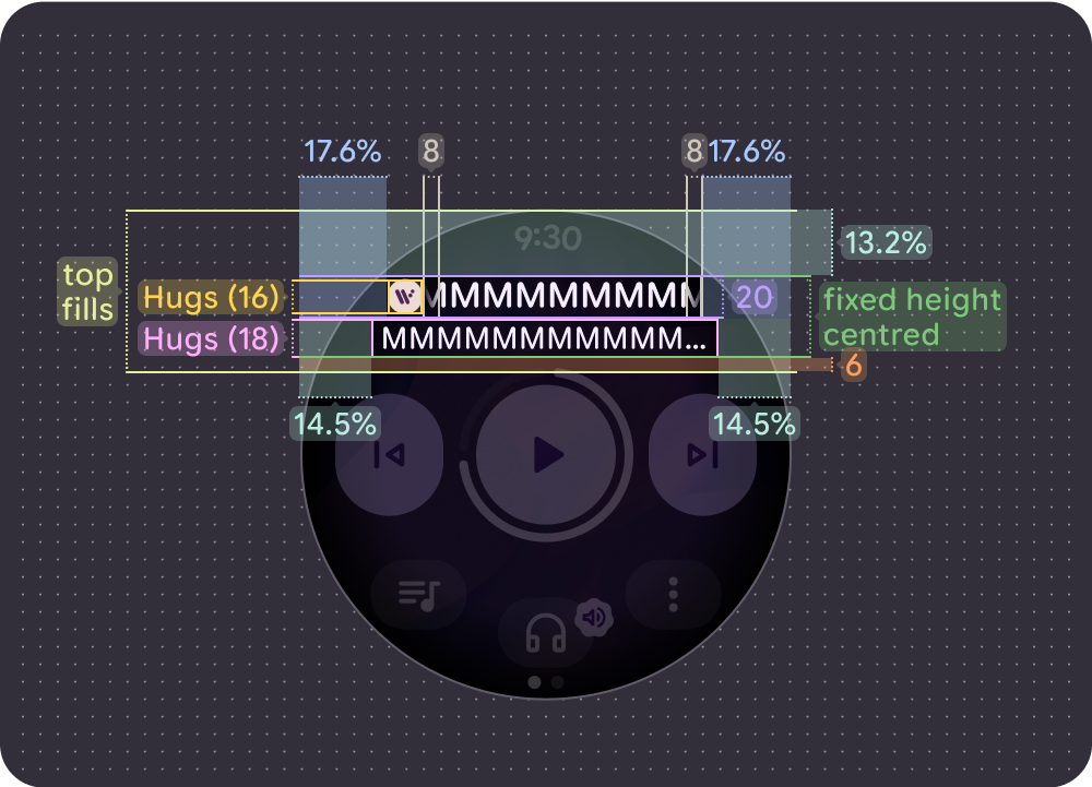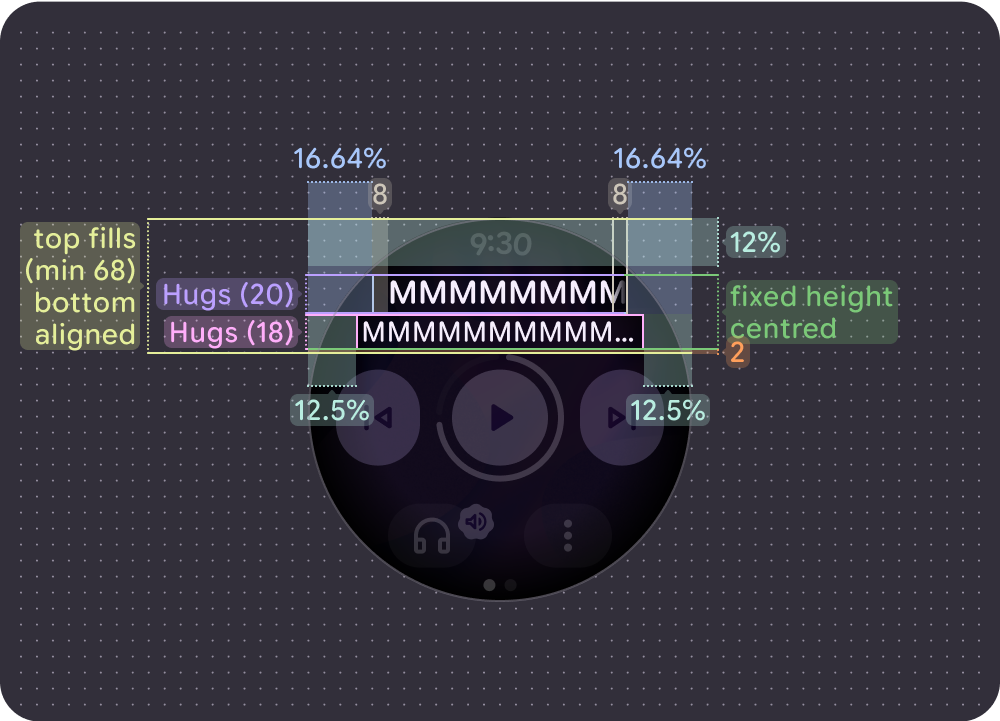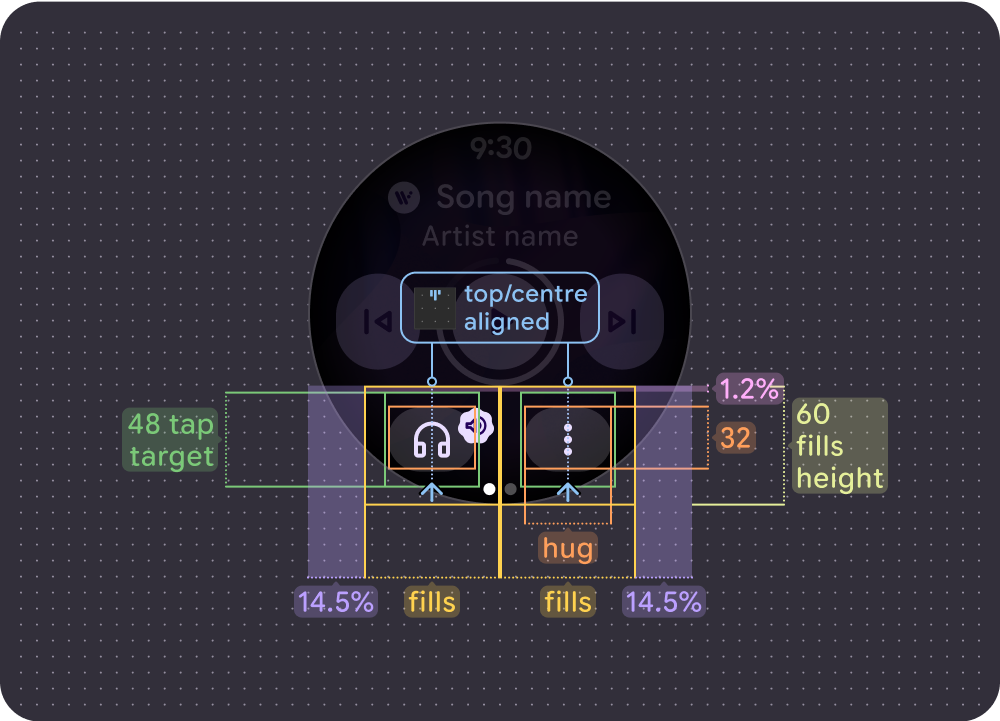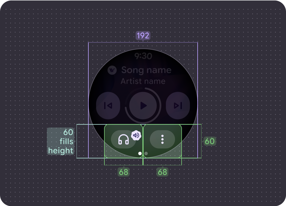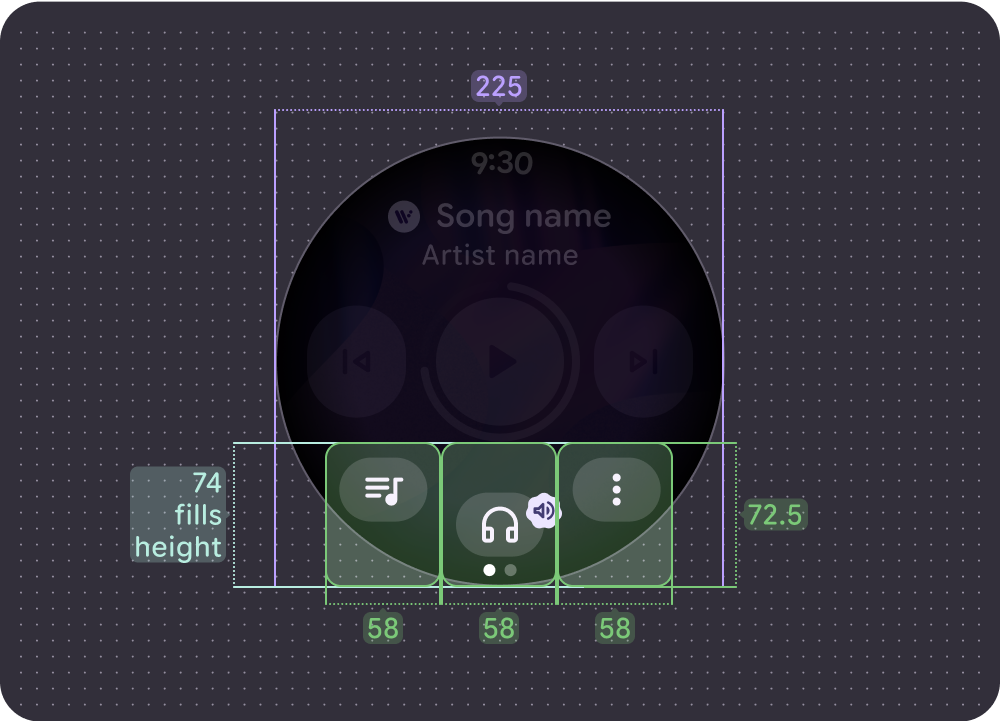 Die Hauptsteuerelemente und unteren Schaltflächen nutzen den verfügbaren Platz, um das Tippziel zu maximieren. Die Mindestgröße für Tippziele beträgt 48 × 48 dp auf Wear OS-Geräten. Symbole und Schaltflächen müssen mittig im Tippziel ausgerichtet sein.