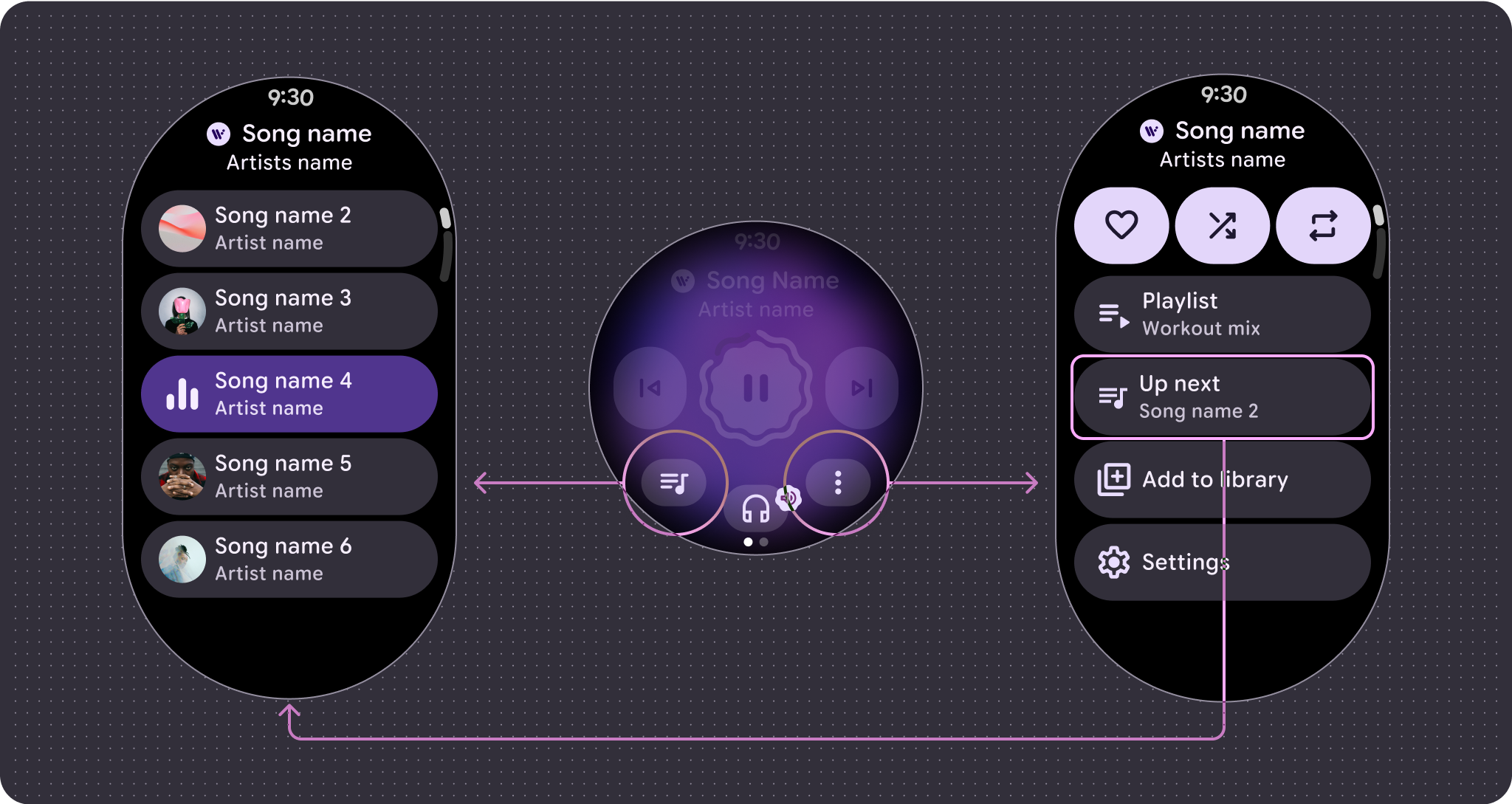 Der Bildschirm mit der Mediensteuerung ist wichtig, damit Nutzer die Medien steuern können, die sie sich anhören. Erstelle Media-Steuerelemente mit einem Layout mit fünf Schaltflächen, um zu prüfen, ob die Mindest-Tippziele erreicht werden. Auf größeren Bildschirmen mit einer Breite von mindestens 225 dp können Sie eine Verknüpfungsschaltfläche für eine wichtige Aktion wie die Wiedergabeliste hinzufügen.