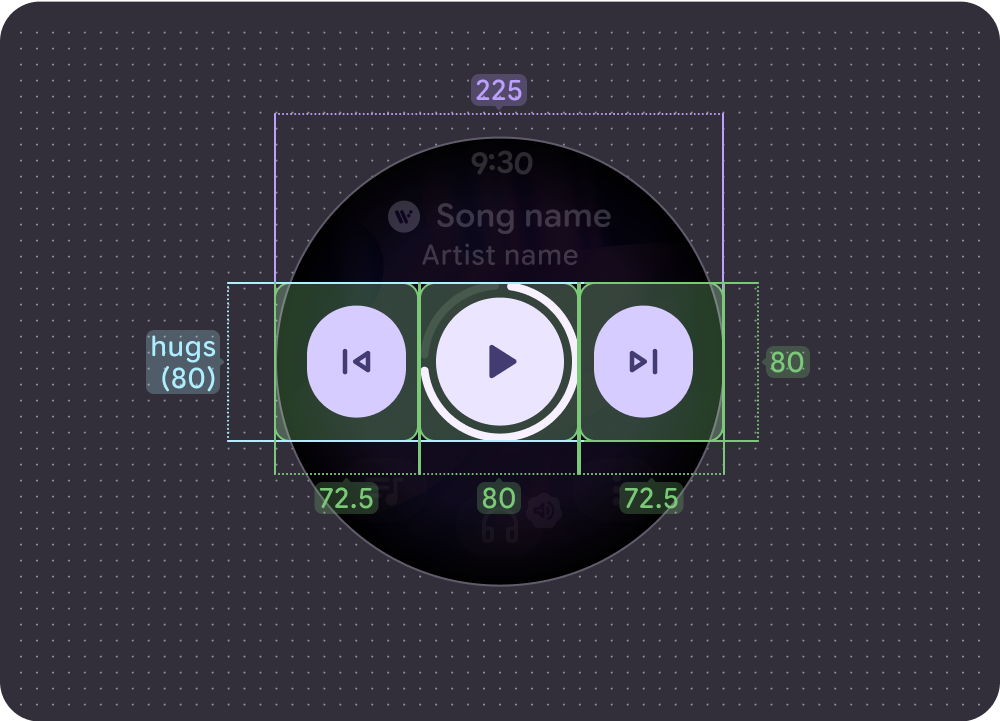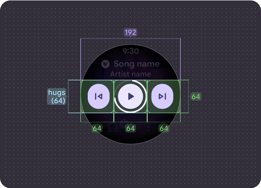 Das wichtigste Steuerelement ist in der Regel die Schaltfläche „Wiedergabe“ und „Pause“. Nach dem Breakpoint von 225 dp wird die Steuerung von 64 dp auf 80 dp skaliert, wodurch die Tippziele für alle Steuerelemente darin vergrößert werden.