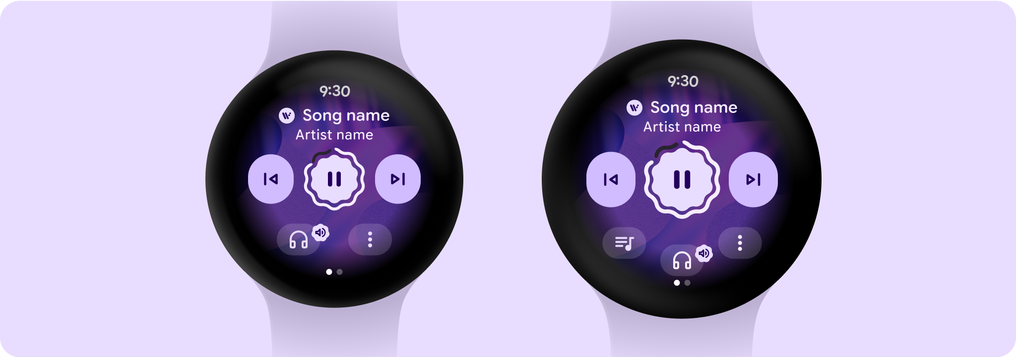 A tela de controles de mídia é essencial para ajudar os usuários a controlar o que estão ouvindo. Crie controles de mídia usando um layout de cinco botões para verificar se os requisitos de área mínima de toque foram atendidos. Em telas maiores, com 225 dp ou mais, você pode adicionar valor incluindo um botão de atalho para uma ação importante, como fila de reprodução.