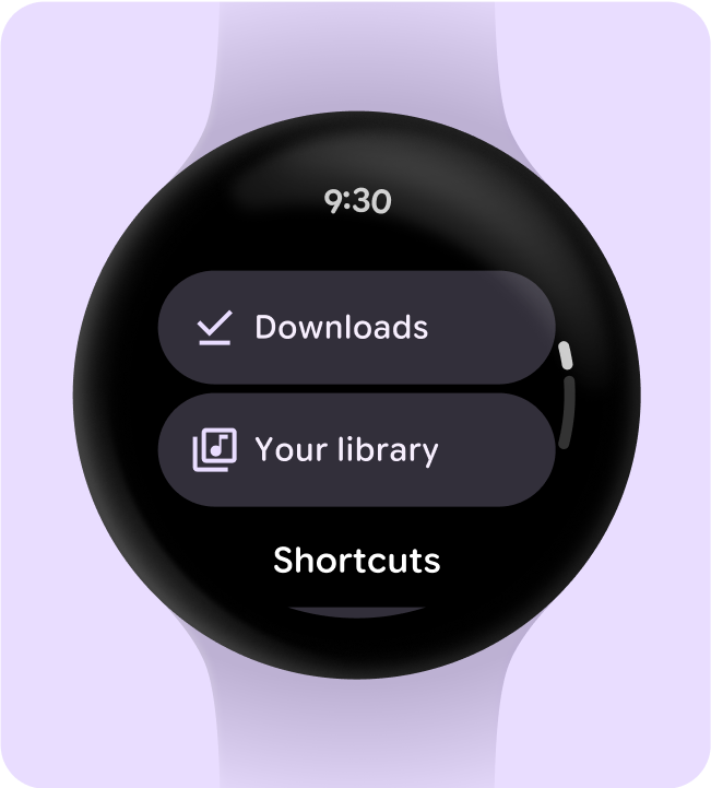 Streaming dari smartwatch menghabiskan daya baterai. Prioritaskan konten yang didownload saat pengguna memilih untuk mendengarkan di smartwatch dengan menampilkan download yang baru saja digunakan dalam daftar penjelajahan. Tambahkan tombol yang mengarahkan pengguna ke daftar download lengkap, seperti yang ditunjukkan pada gambar berikut.