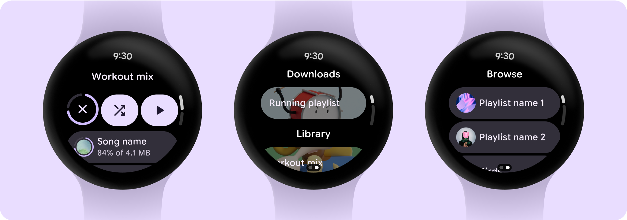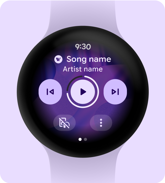 Jika perangkat sumbernya adalah smartwatch, minta pengguna untuk memilih output audio sebelum mereka mulai mendengarkan musik. Setelah pengguna memilih perangkat output, putar media dan tampilkan ikon perangkat output—seperti headset atau earbud—di kontrol media.