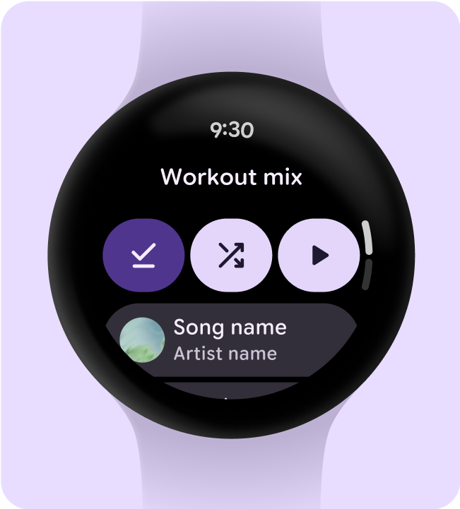 ソースデバイスがスマートウォッチの場合は、音楽を聞き始める前に音声出力の選択を求めるメッセージを表示します。ユーザーが出力デバイスを選択したら、メディアを再生し、メディア コントロールに出力デバイスのアイコン(ヘッドセットやイヤホンなど)を表示します。