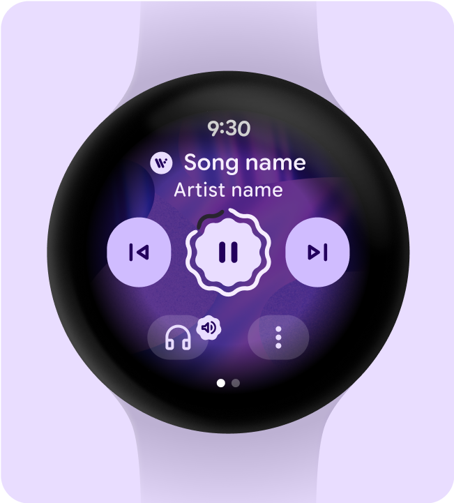 Se o dispositivo de origem for o relógio, peça para o usuário selecionar a saída de áudio antes de começar a ouvir música. Depois que o usuário selecionar um dispositivo de saída, reproduza a mídia e mostre o ícone do dispositivo de saída, como um fone de ouvido, nos controles de mídia.