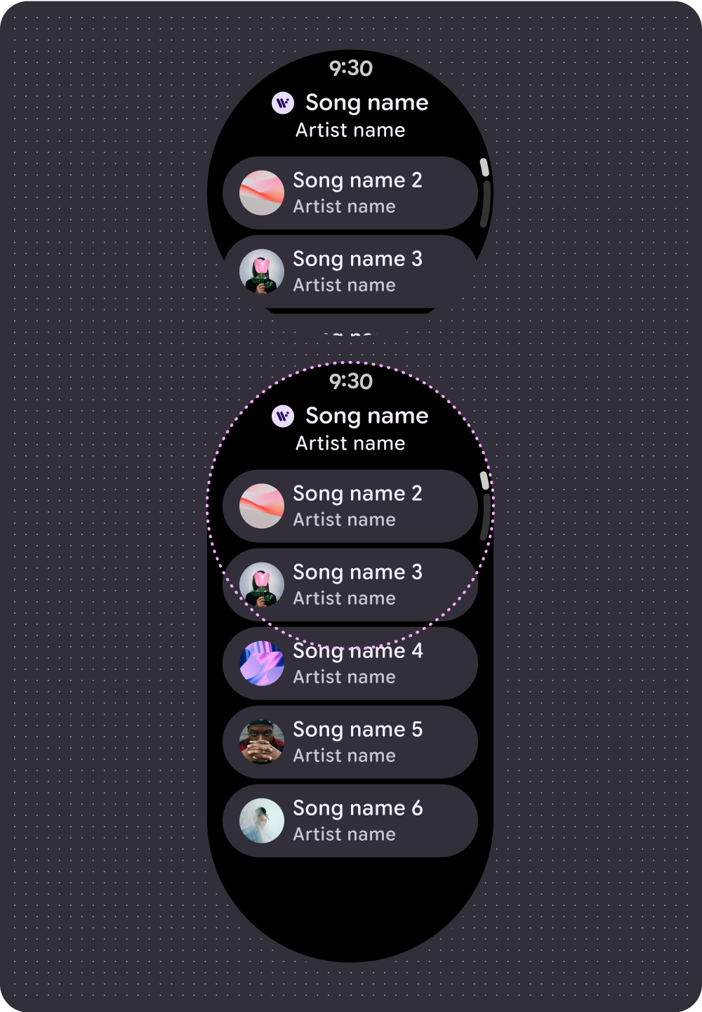 Reduce la jerarquía de tu app y muestra el contenido multimedia para el usuario. Realiza el diseño con una arquitectura de información plana que les permita a los usuarios acceder rápidamente a las listas y mostrar miniaturas. Considera usar componentes de diseño personalizados para Wear OS.