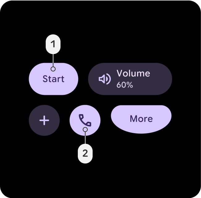 Wear Material 3 표현 색상 시스템은 주요 구성요소에 3개의 강조 레이어(기본, 보조, 3차)와 2개의 중립 표면 레이어를 사용합니다. 각 역할은 일관된 대비를 갖는 다양한 값을 제공하므로 어떤 테마에서든 통일된 환경을 위해 표현력이 풍부하면서도 접근성이 뛰어난 색상 조합을 사용할 수 있습니다.
