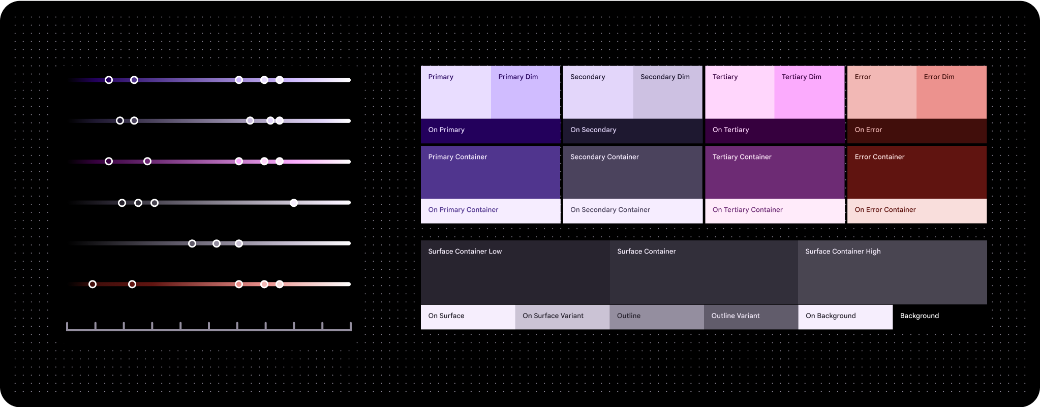 - একটি পেইন্ট-বাই-সংখ্যা ক্যানভাসে "সংখ্যা" এর মতো, রঙের ভূমিকা নির্দিষ্ট UI উপাদানগুলিতে বরাদ্দ করা হয়। তাদের প্রাথমিক, প্রাথমিক এবং প্রাথমিক কন্টেইনারের মতো নাম রয়েছে। একই রঙের ভূমিকা হালকা এবং অন্ধকার উভয় থিমের জন্য ব্যবহৃত হয়। সমস্ত রঙের ভূমিকা দেখুন