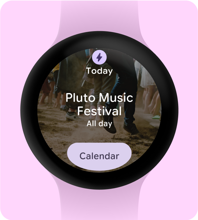 Bu özellik etkinleştirildiğinde (örneğin, ProtoLayout Material3 PrimaryLayout kullanılarak), Wear OS, kullanıcı Kart bandında kaydırırken otomatik olarak gösterilecek olan kalıcı uygulama simgesini otomatik olarak gösterir. Uygulama simgesi, kutunun parçası olarak tasarlanıp eklenmemelidir.