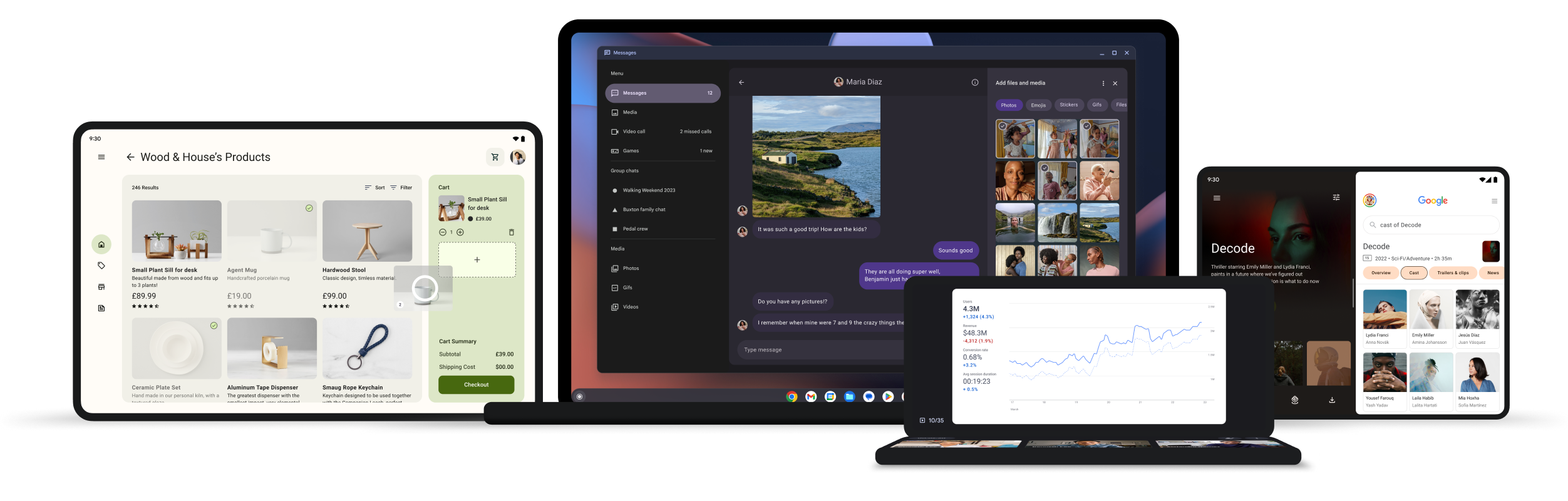 Diseña apps para Android modernas y atractivas que lleguen a los usuarios dondequiera que estén, ya sea que naveguen en su teléfono, lean en su tablet, miren su muñeca, trabajen en un dispositivo ChromeOS o miren la TV.