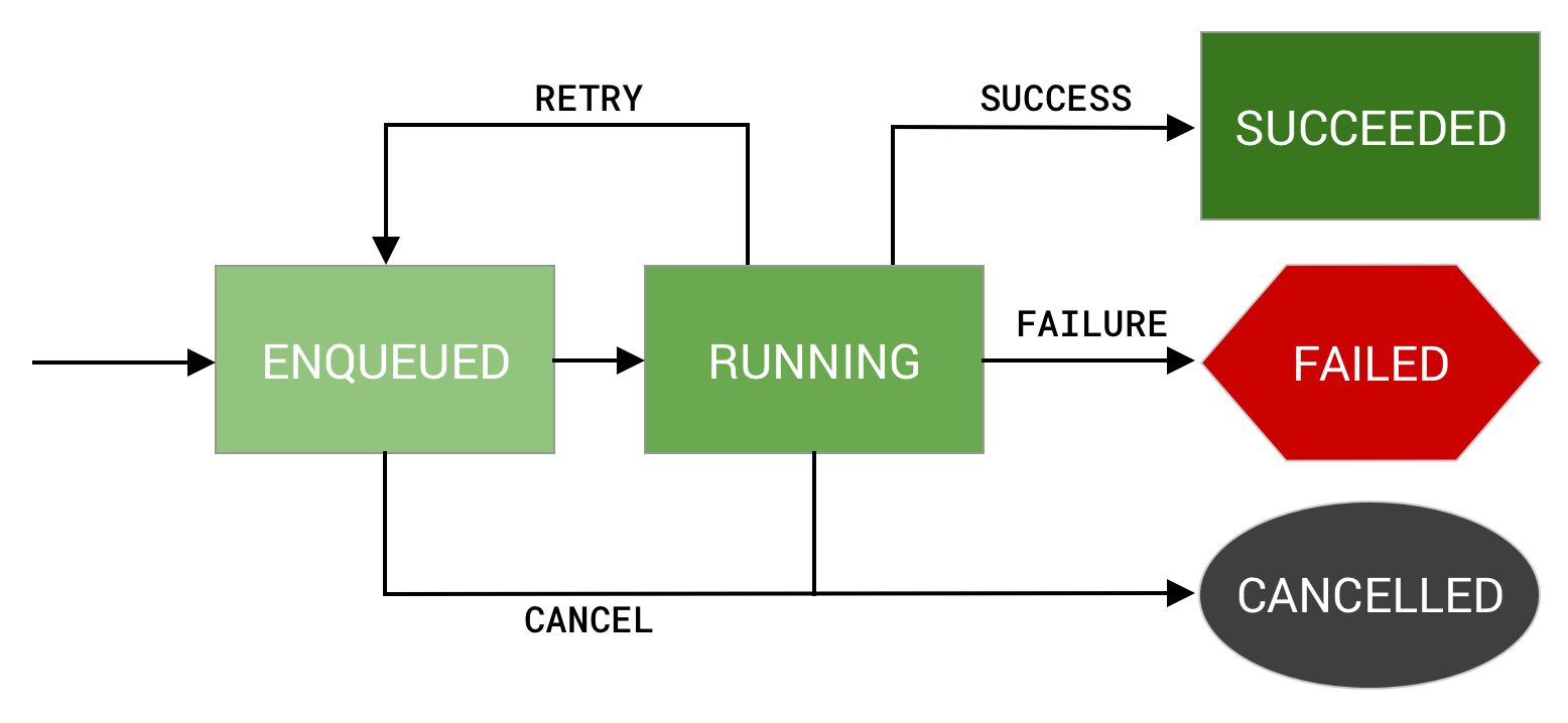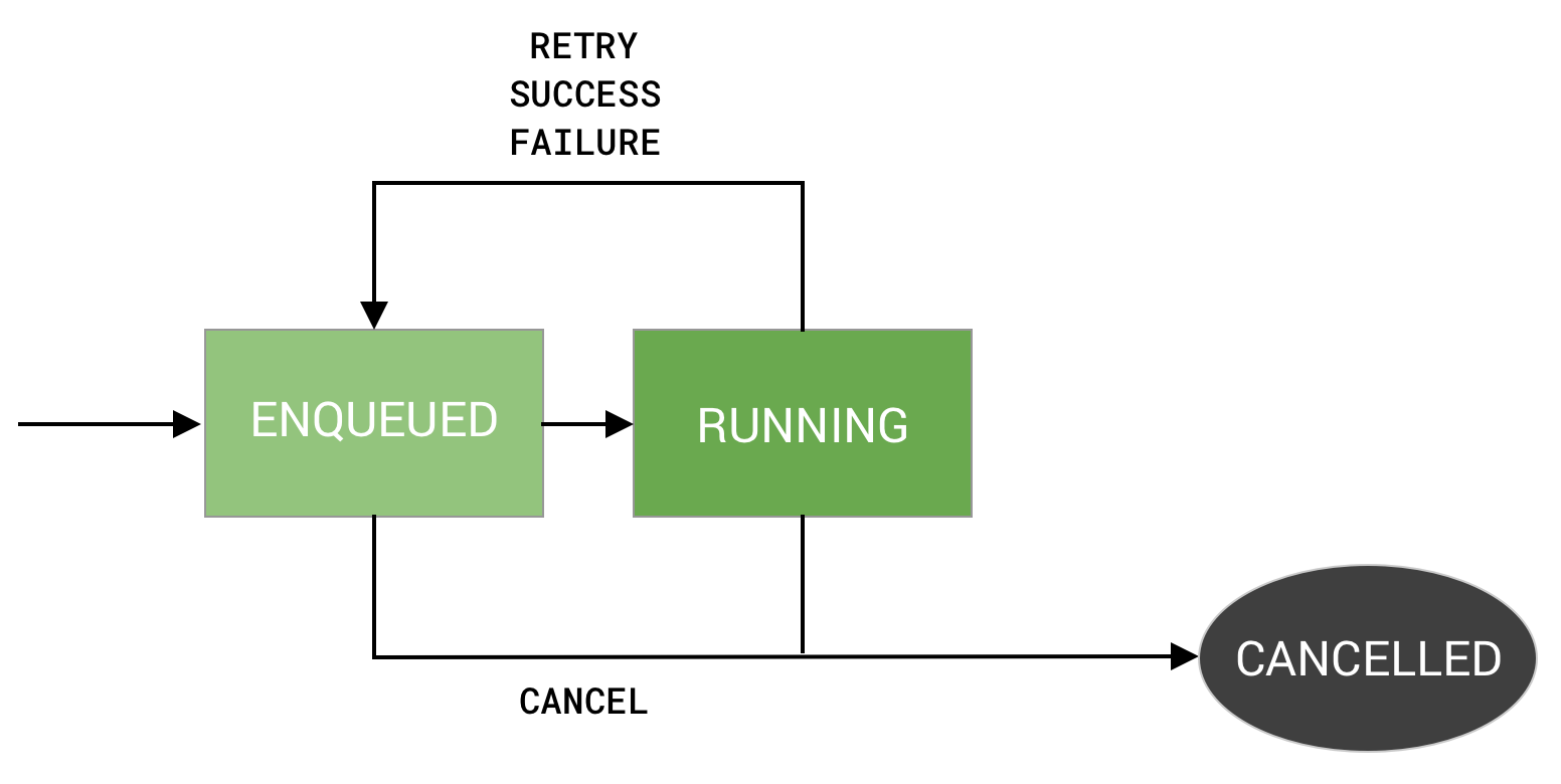 在 ENQUEUED 状态下,您的工作会在满足其 Constraints 和初始延迟计时要求后立即运行。接下来,该工作会转为 RUNNING 状态,然后可能会根据工作的结果转为 SUCCEEDED、FAILED 状态;或者,如果结果是 retry,它可能会回到 ENQUEUED 状态。在此过程中,随时都可以取消工作,取消后工作将进入 CANCELLED 状态。
