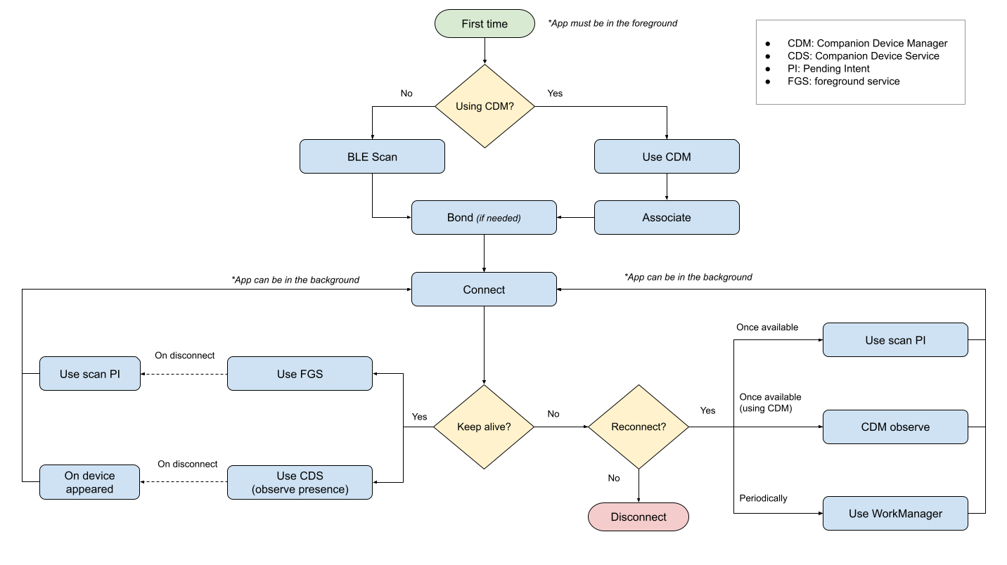 アプリがバックグラウンドにある間、デバイスへの接続に制限はありませんが、プロセスが強制終了されると接続は閉じられます。また、バックグラウンドからのアクティビティの起動に関する制限(Android 10 以降)またはフォアグラウンド サービス(Android 12 以降)があります。
